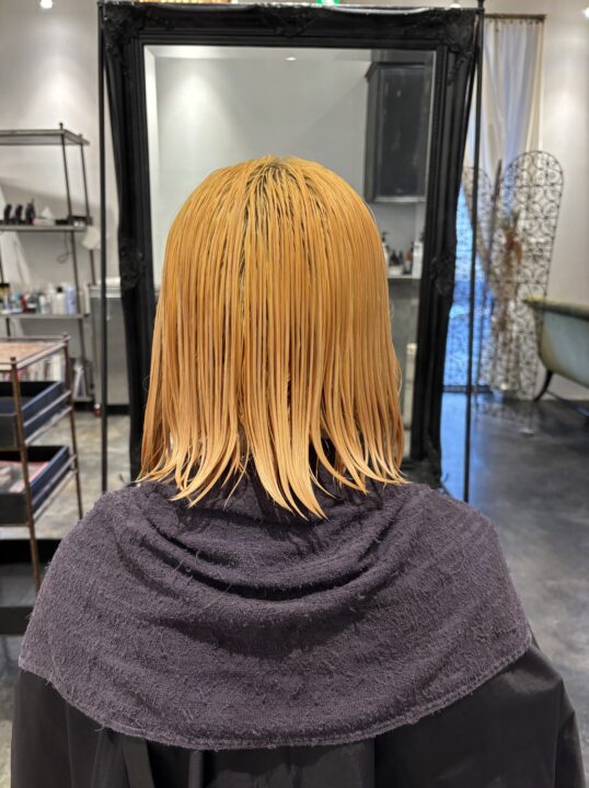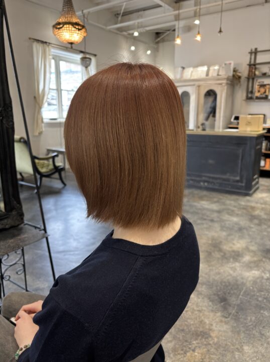 ブリーチありのオリーブグレージュ。暗めでも色味がちゃんと見える組み合わせで、透明感のあるカラーにしました。