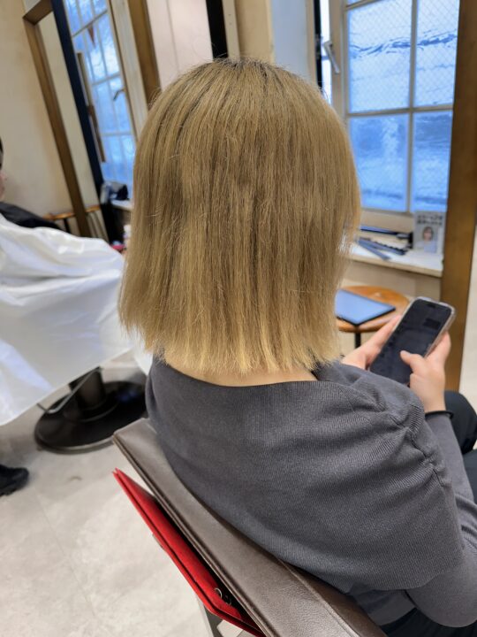 ブリーチ毛からのトーンダウン。透明感と色持ちの良いグレージュカラー。