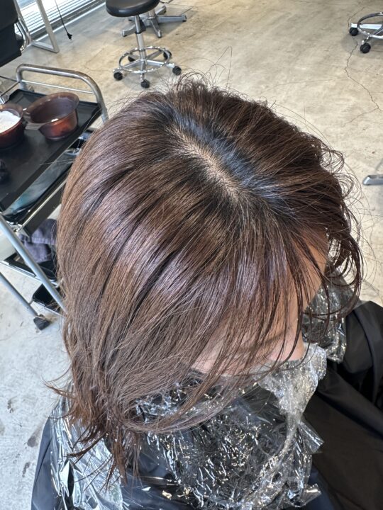 柔らかく赤みの少ない透明感のあるベージュに、細めのハイライトを入れ白髪をぼかしています。