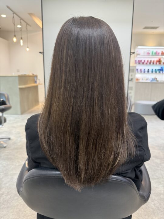 毛先にはアッシュを入れることでオレンジみを消して透け感たっぷりのグレージュを表現しました。