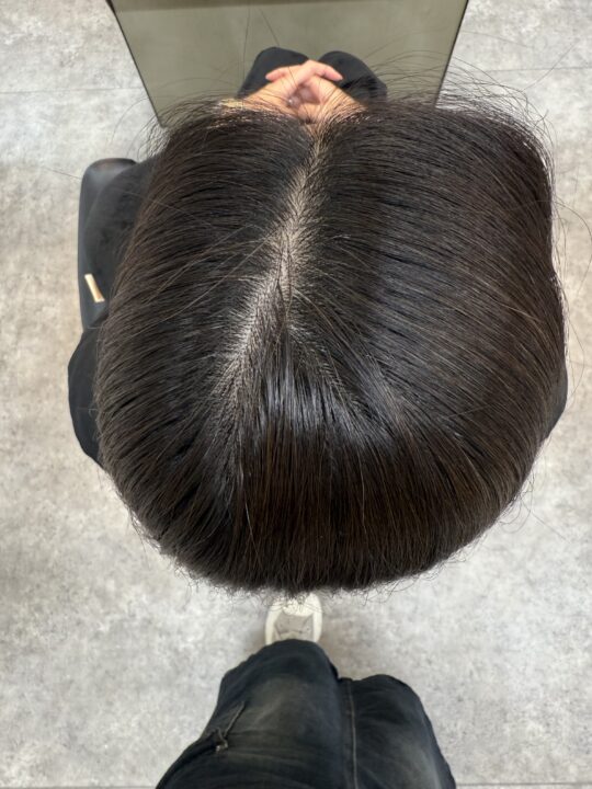 ブルーブラウンベースのNGと、GRで根元の白髪はしっかりと染めつつ、赤みは消して透明感を。