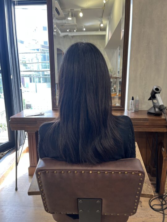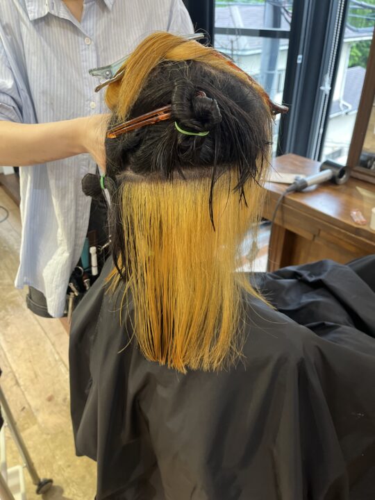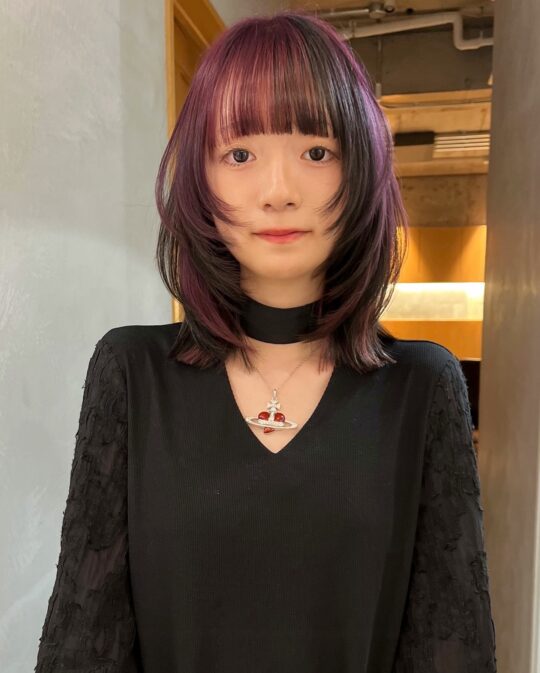 もとの黒髪はいかしてランダムにブリーチでハイライト、ハイライト部分にのみパープルを入れています。
