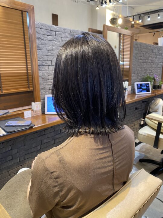黒染めみたいに落ち着かせるのは抵抗があるので、自然光でみると青みを感じるようにしました。