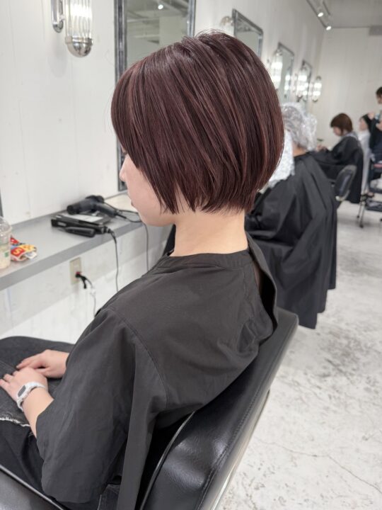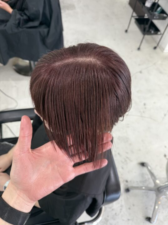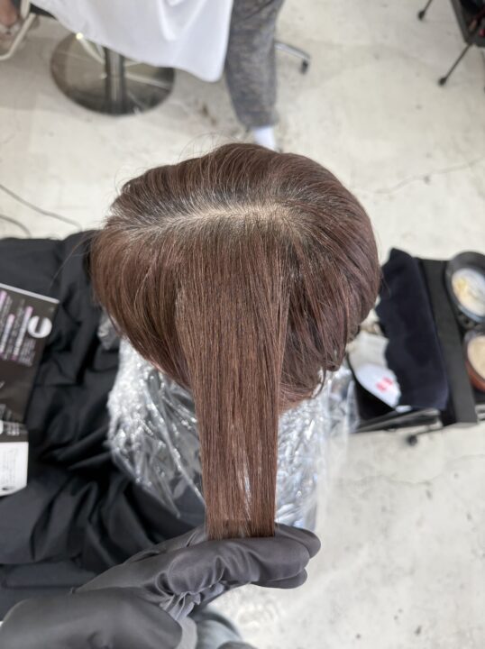 アドミオカラーの特徴を活かし、白髪をしっかり染めるのではなく、ぼかしてなじませるカラーデザインです。