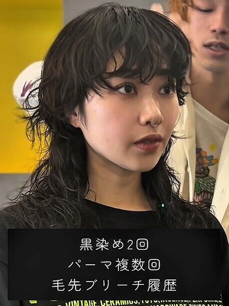 黒染め、パーマ毛からポイントでブリーチをしてダメージを抑えたデザイン