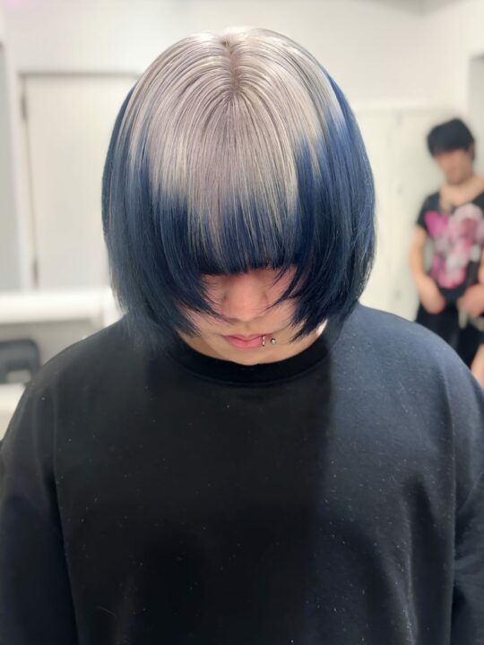 ルーツはホワイトカラーで、中間・毛先は縮毛とブリーチ黒染め履歴があったので、ネイビーブルーで仕上げました。
