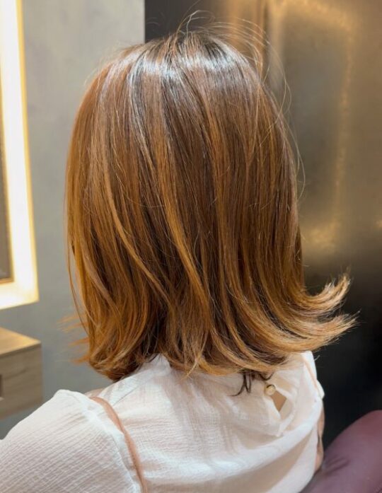 赤みが出やすい髪質にオリーブカラーを施して馴染みよく仕上げました