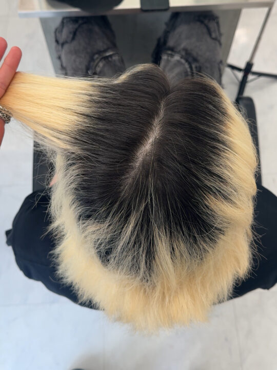 根元が半年以上のリタッチなのでホイルとアリミノブリーチ120を使ってムラなく均一にベースを上げて綺麗に仕上げました