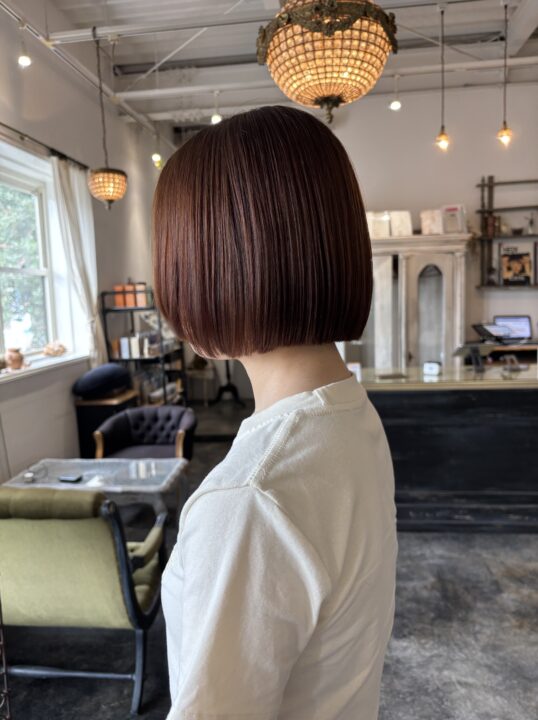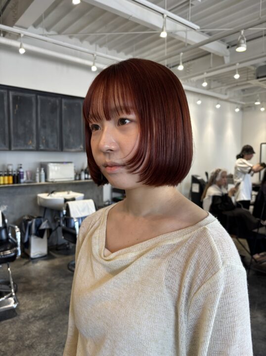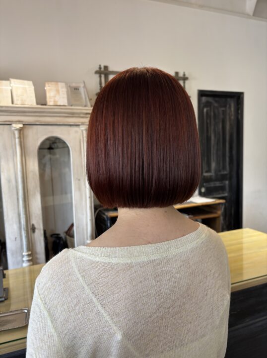 ストレートパーマ履歴有りのブリーチもしないカラーですが、なるべくオレンジが発色するように組み合わせました。