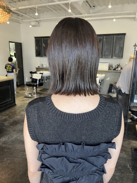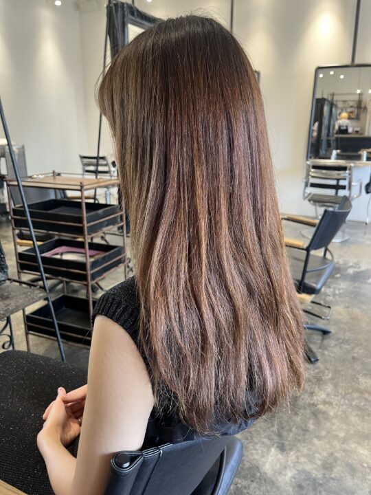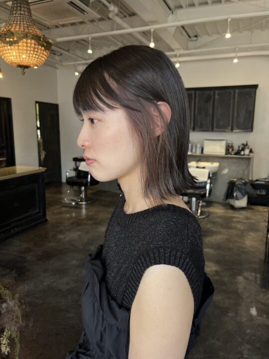 表面を6Lvのオリーブグレージュにトーンダウンして艶感をプラスし、ミルクティーグレージュのインナーカラーで遊びを効かせてみました。