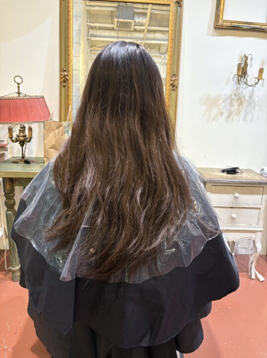 オレンジみがある髪色だったので、青味のあるベイリーフを補色で使ってオリーブカラーを作りました。
