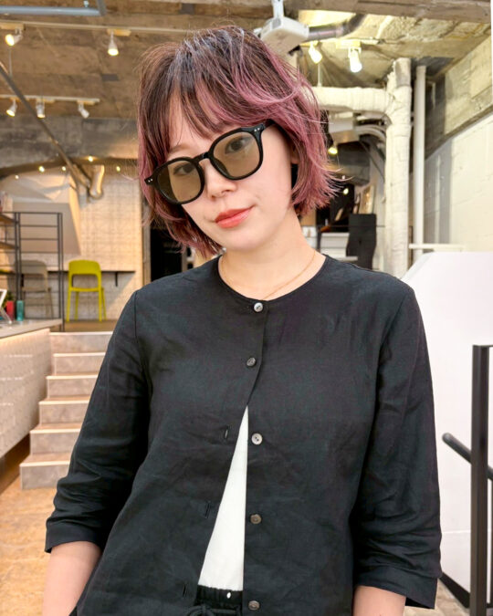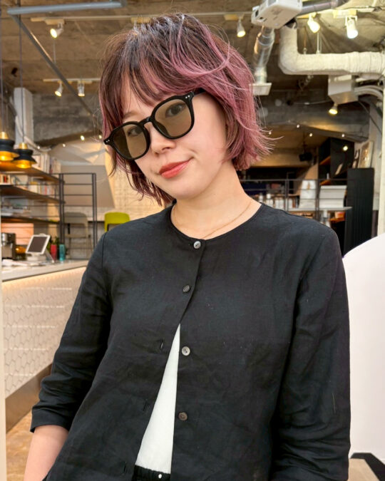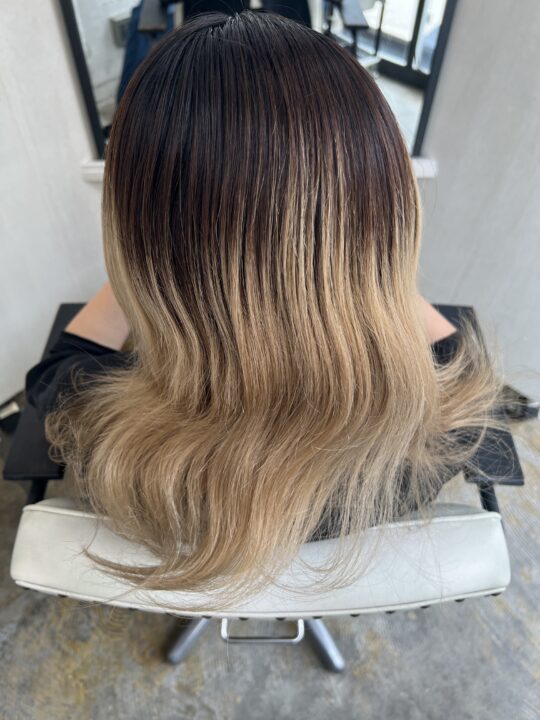 前回からブリーチをやめていくお客様に、ルーツ/ブラウン・毛先/ピンクのプレイングカラーでディバイディングラインのボケ感を出したカラーです。