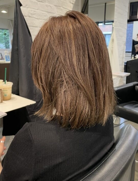 褪色後の特有のオレンジみを消しつつ、ハイライトの部分は染まりすぎない明るめ×ナチュラルなハイライトカラーです