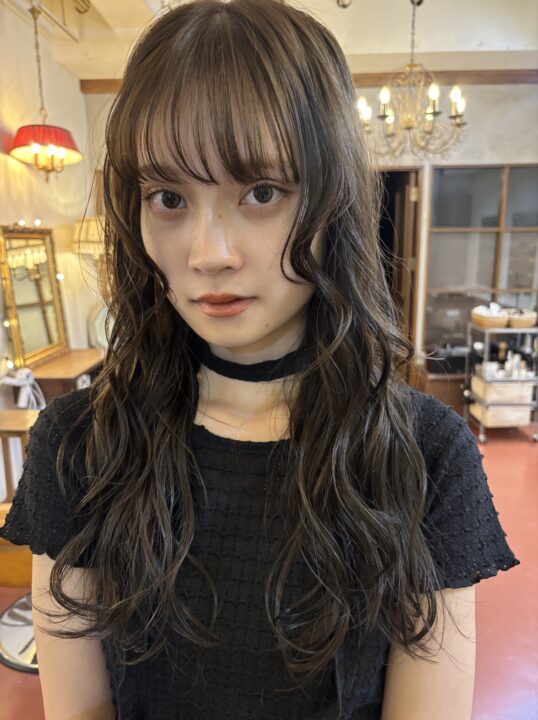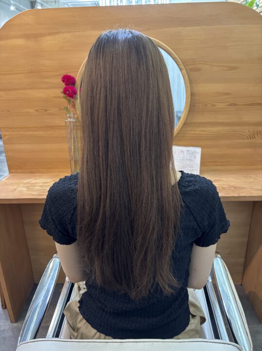 根元から中間まではオレンジみが強かったので、ちょっとトーンを落とし、毛先は沈んでいたので12レベルで中間と馴染むようにしました。