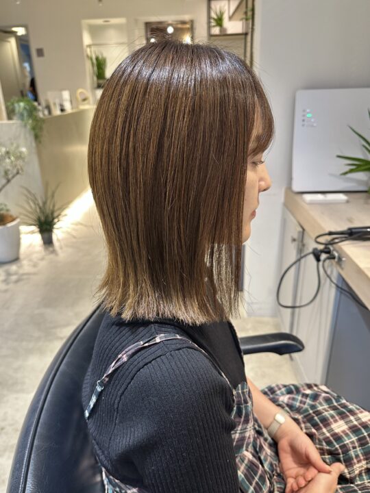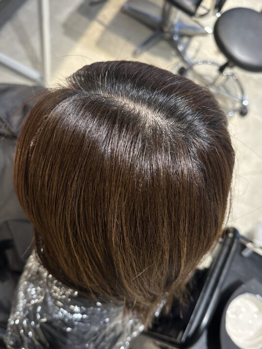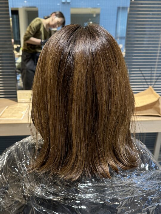 表面には細めのハイライトを入れて白髪ぼかしをしつつ、オシャレ感と動きをプラスしています。
