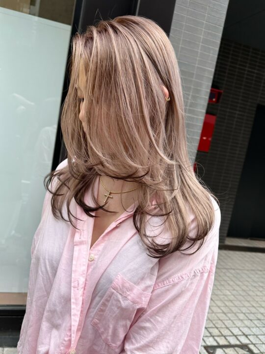 ベースは秋っぽくミルクティーにほんのりピンクを感じる選定に、毛先をダークブラウンのエンドカラー入れることで遊びをきかせたスタイル