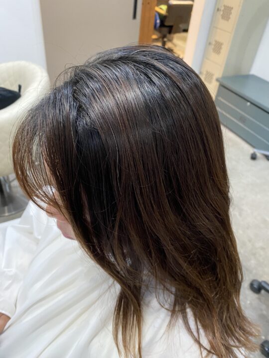 グレイカラーのオレンジみが出やすいお客様なので補色を組み合わせながら、くすみすぎない柔らかいグレージュにしました。