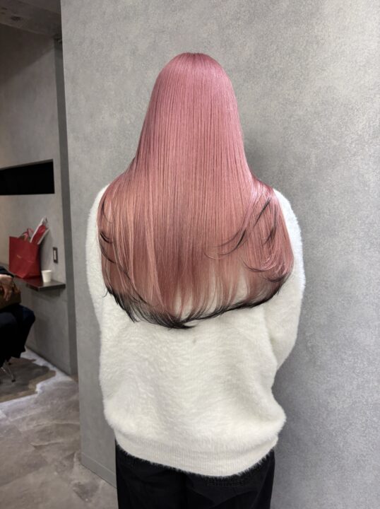 ペールピンクを全頭カラーした後に毛先黒のデザインを入れ、よりレイヤーを主張する激カワデザインにしました。