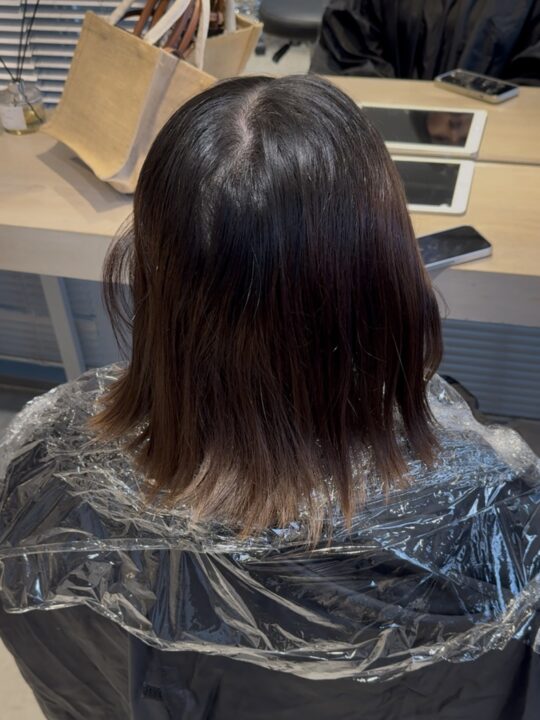 補色でアッシュとオリーブを入れることで退色後も赤みのでない仕上がりに。