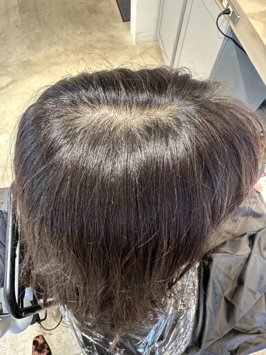 根元の白髪部分と中間〜毛先を塗り分けていて、根元は透明感を出しながら白髪を染め、毛先はダメージを抑えながら優しくカラーをしています。