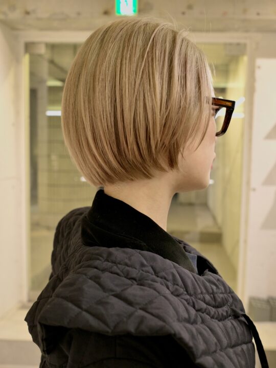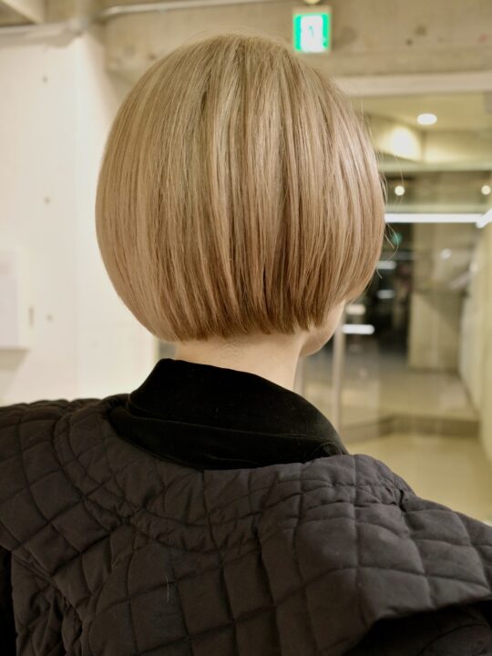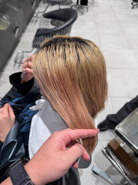 ピンク系の残留色素が残っている状態からブリーチはリタッチだけ、オンカラーでピンクみを抑えています。