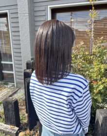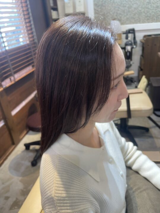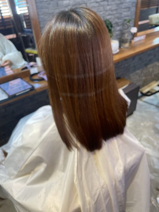 チェスナットブラウンのような柔らかいブラウンで、明るくもなく、暗くもない艶と透明感を出せるように染めてみました。