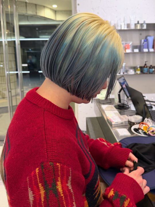 ブロンドからブルーグレーにつながるデザインカラーのボブスタイル。