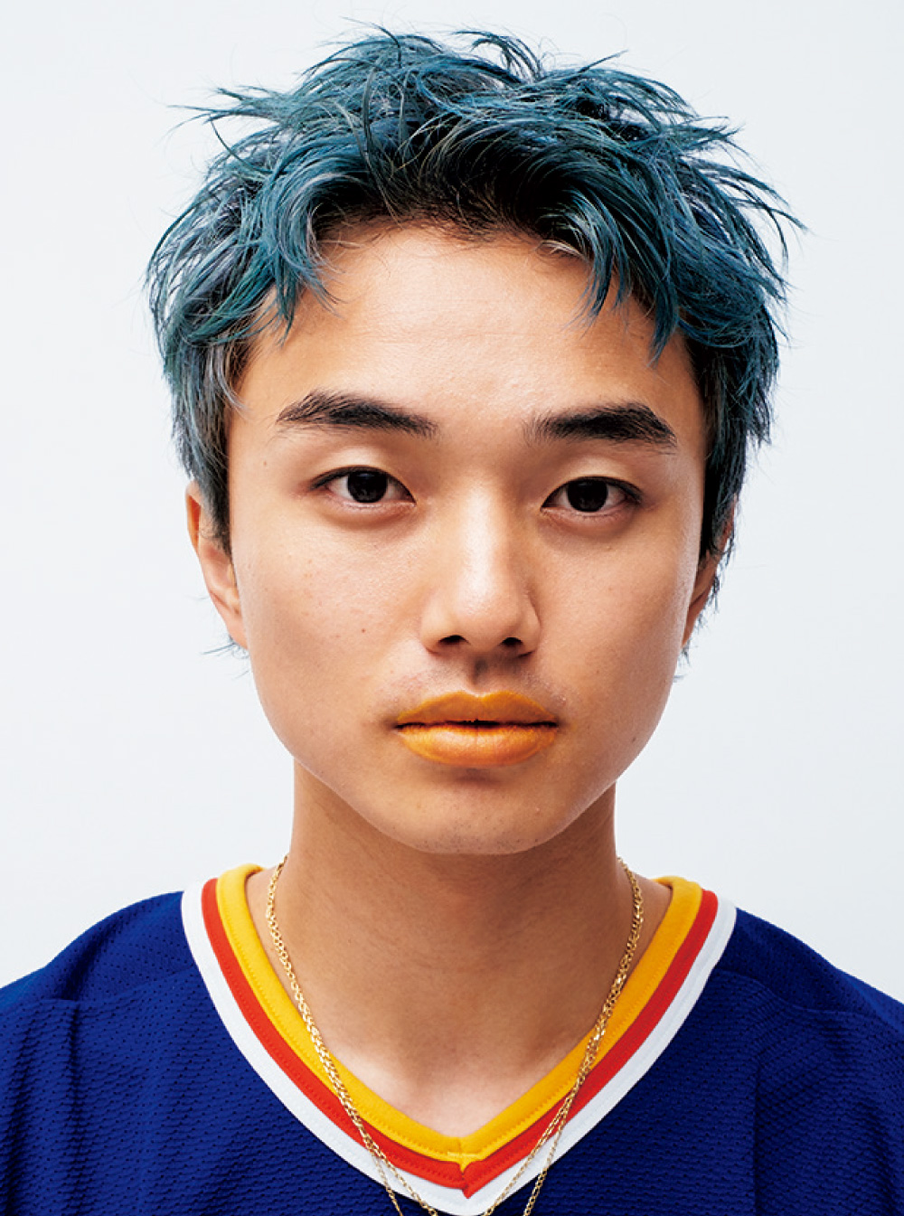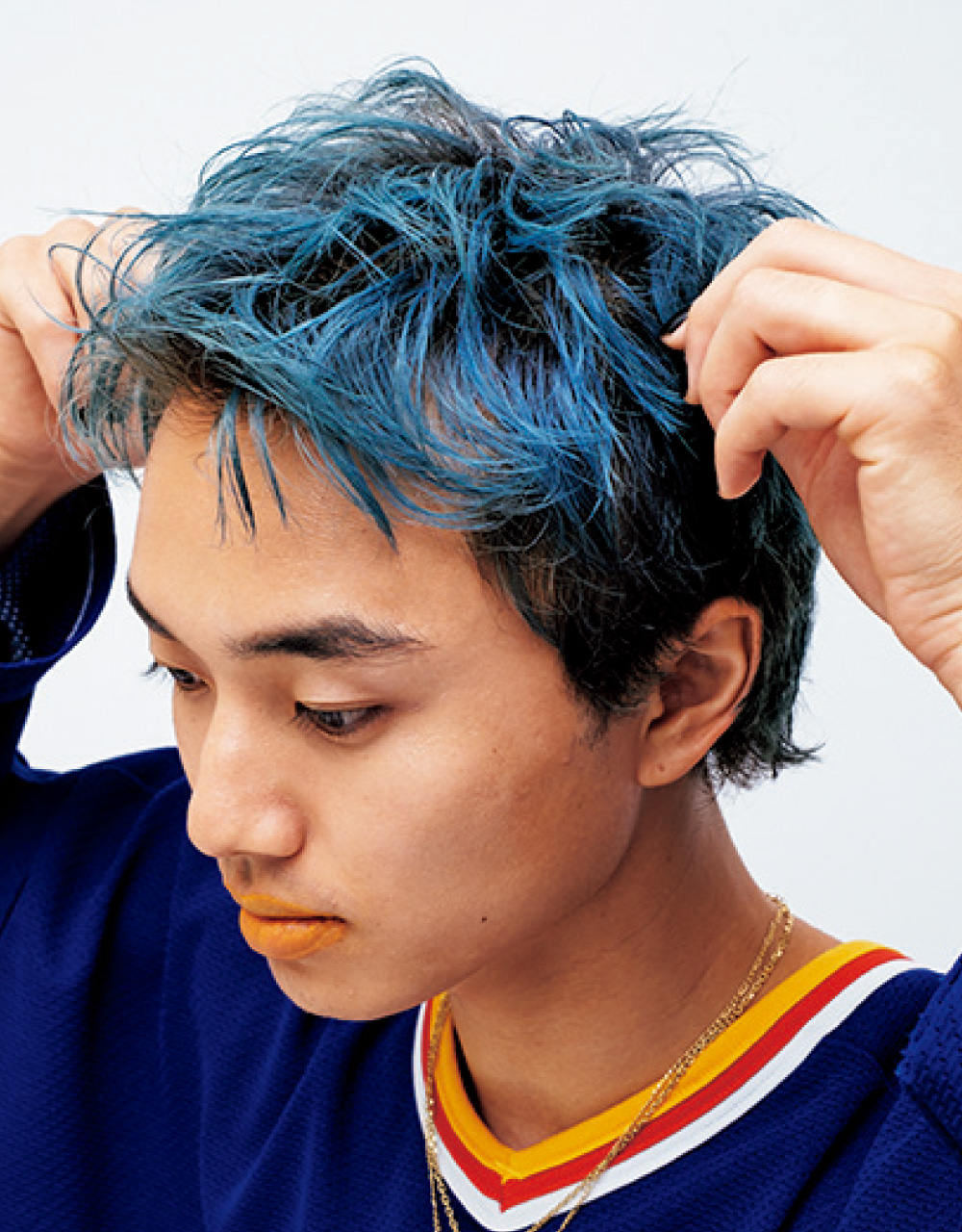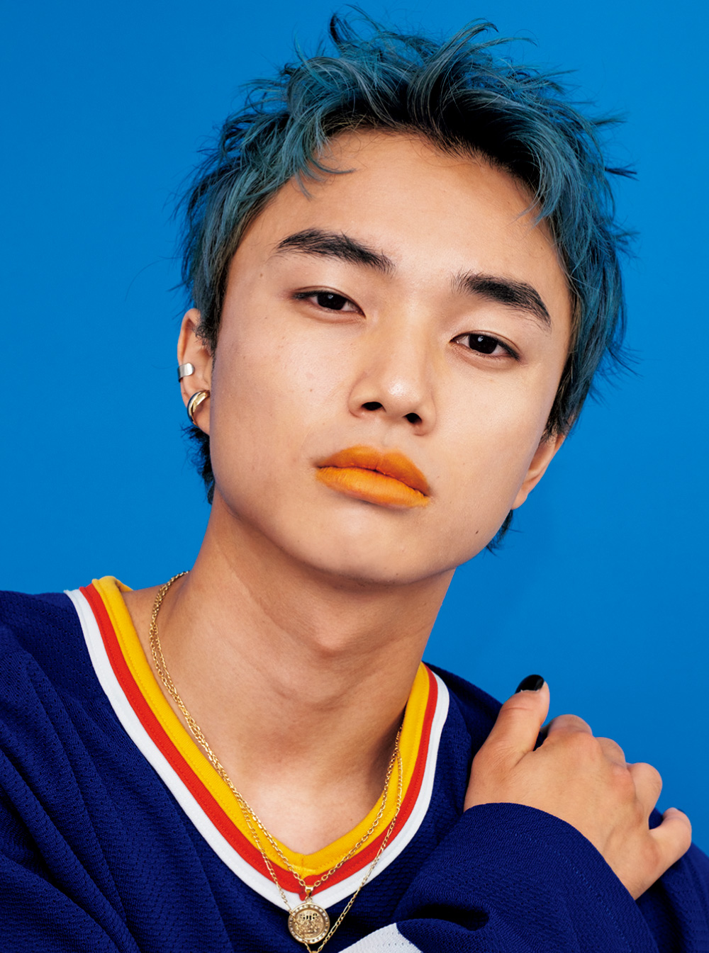 ブルーの補色であるオレンジをリップに使うことで、お互いの色味を引き立てつつ、自由でやんちゃな印象に。