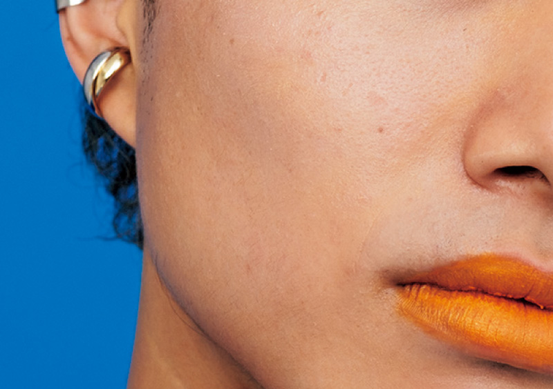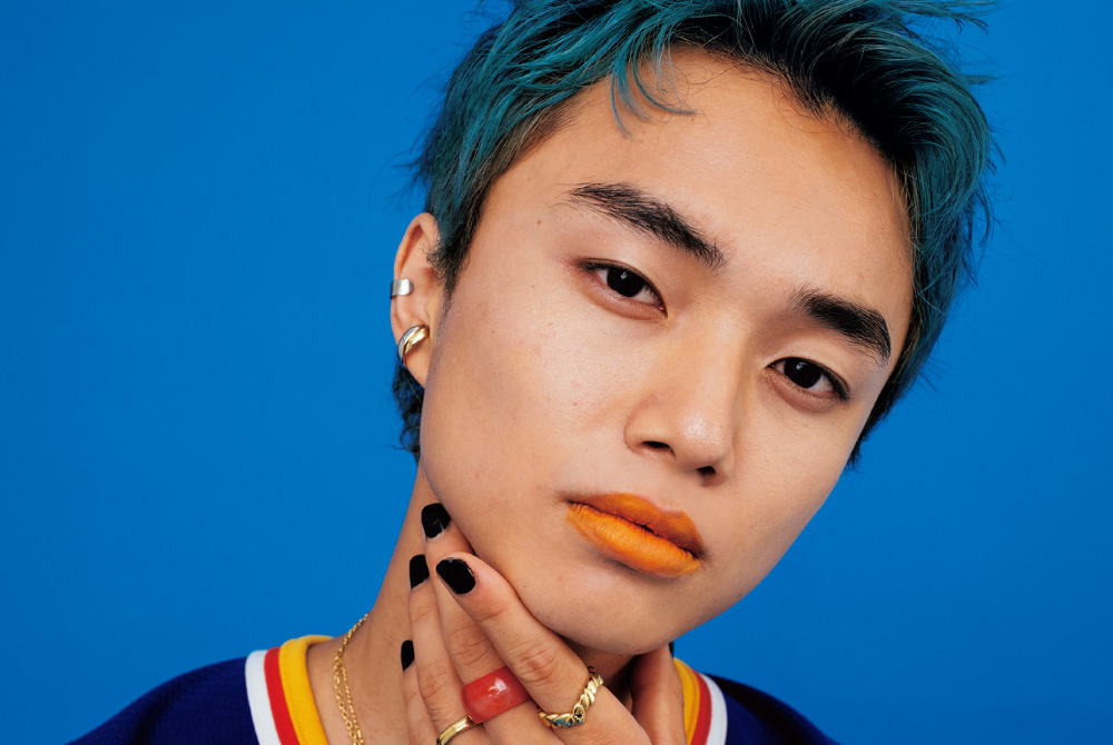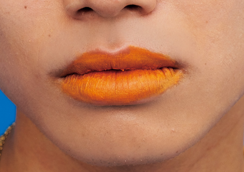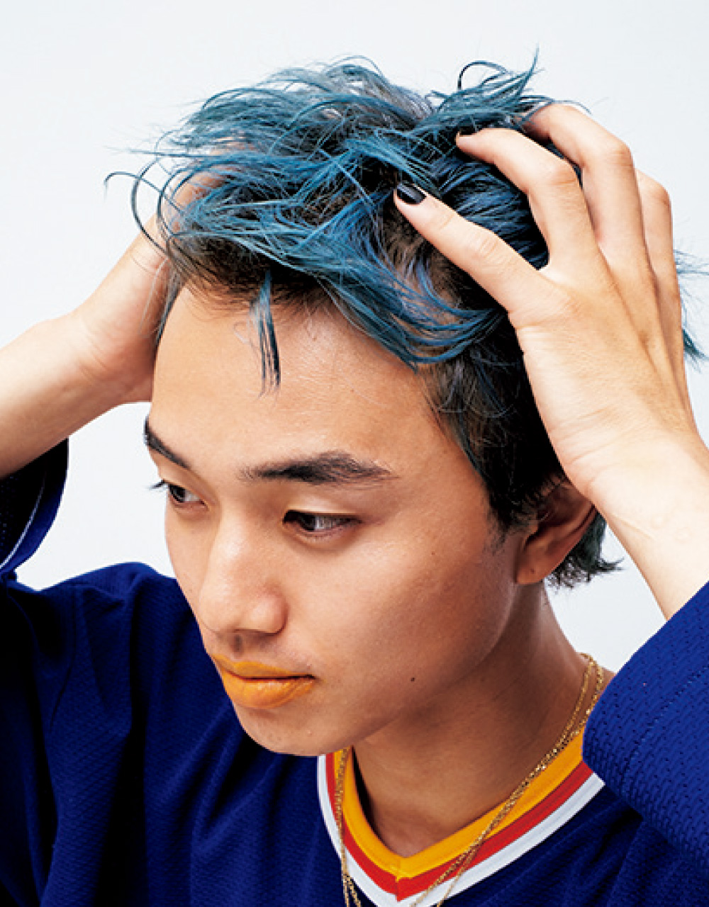 ブルーの補色であるオレンジをリップに使うことで、お互いの色味を引き立てつつ、自由でやんちゃな印象に。