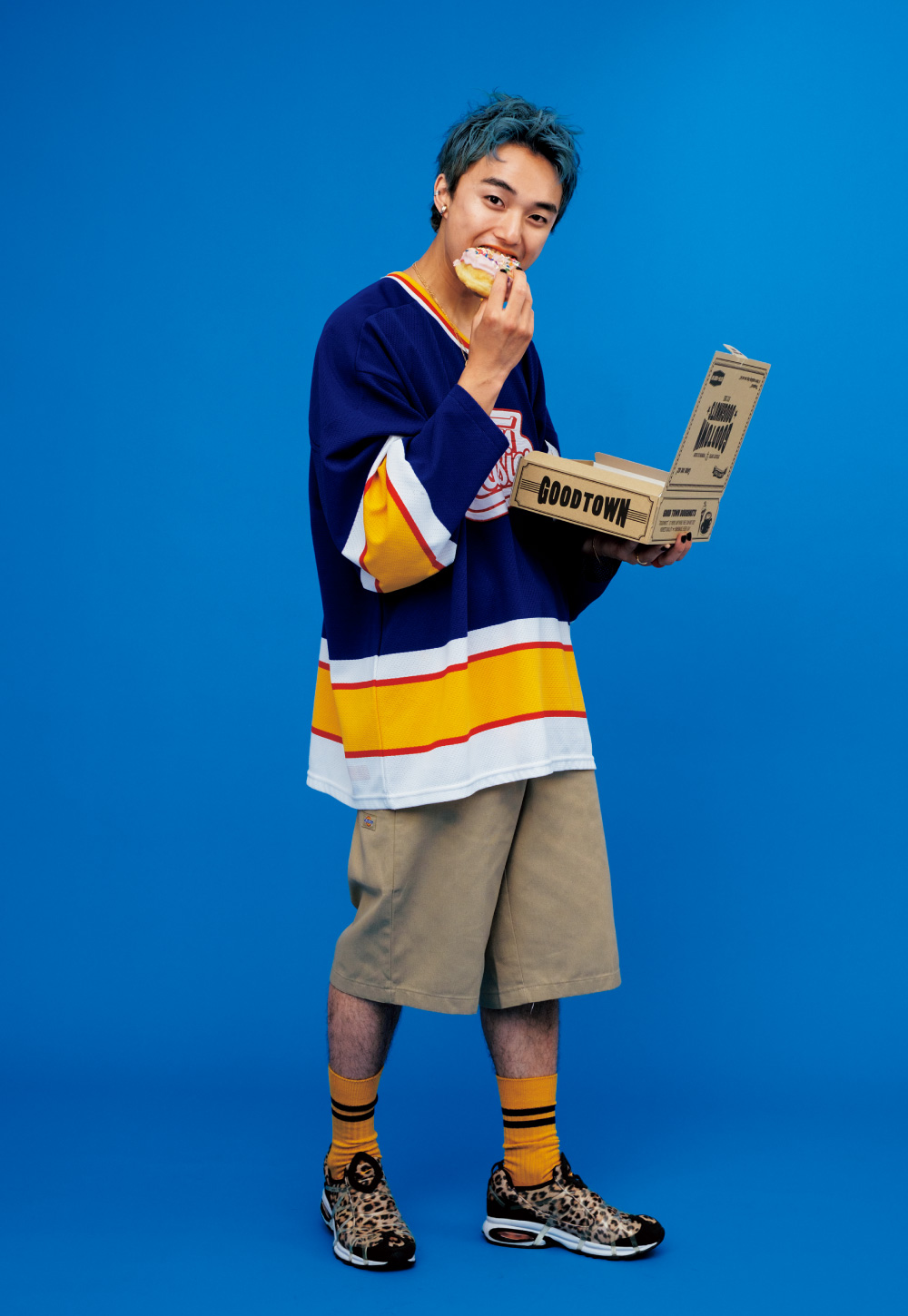 トレンドのユニフォームTシャツをメインに、Tシャツの柄に合わせたラインソックスで遊びを持たせた。ボトムは逆にスポーティに寄せすぎず、カジュアルなハーフパンツをセレクト。アクセサリーはゴールドとシルバーをミックスし、さらにリップと合わせオレンジのリングをポイントに。レオパード柄のスニーカーもアクセントになり、スポーティな中にセンスと個性が効いたコーディネート。