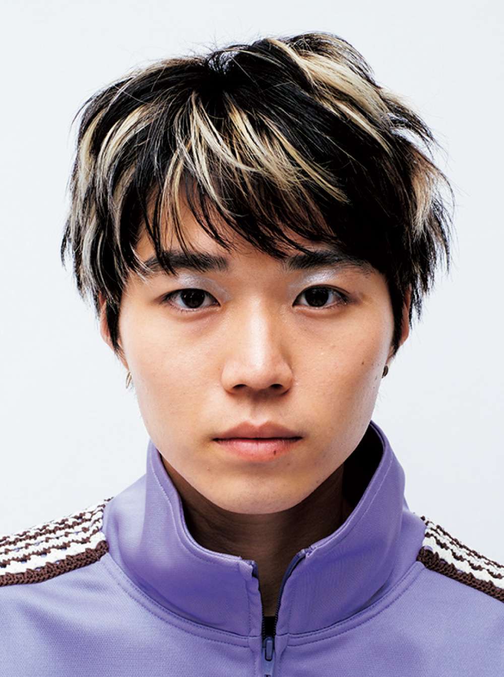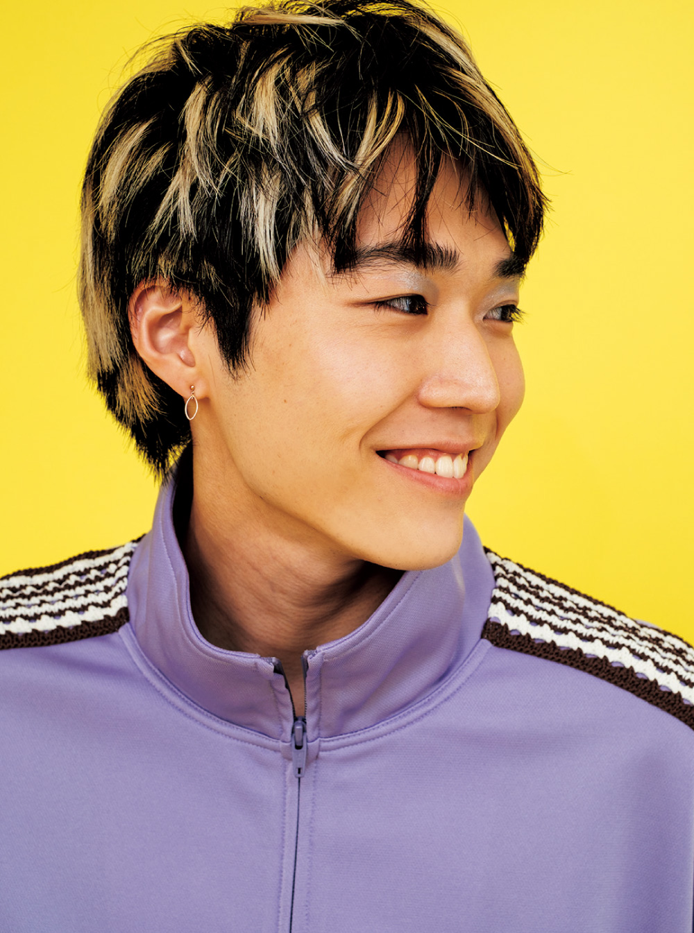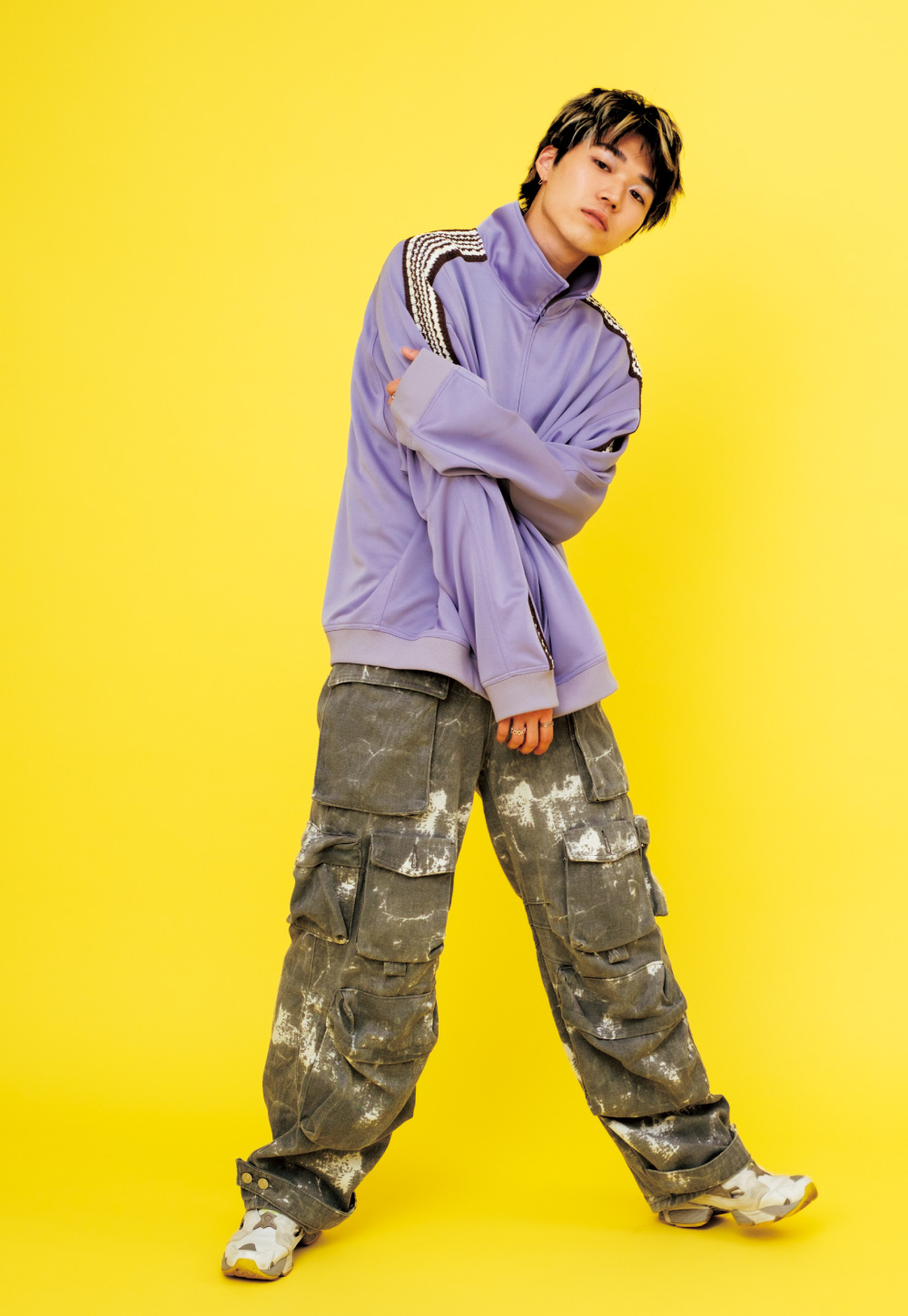 鮮やかなパープルが中性的な魅力を引き出すダブルジップのトラックジャケットは、下のジッパーを多めに開けることでバランスがきれいに取れる。パンツは単色だとヘアスタイルに負けて物足りなさが出てしまうので、デザインカラーに合わせてペイント柄をセレクト。アクセサリーはアイメイクに合わせてシルバーで統一し、スポーティなアイテムを使いながらも色数を抑えることでモードな雰囲気にまとめた。