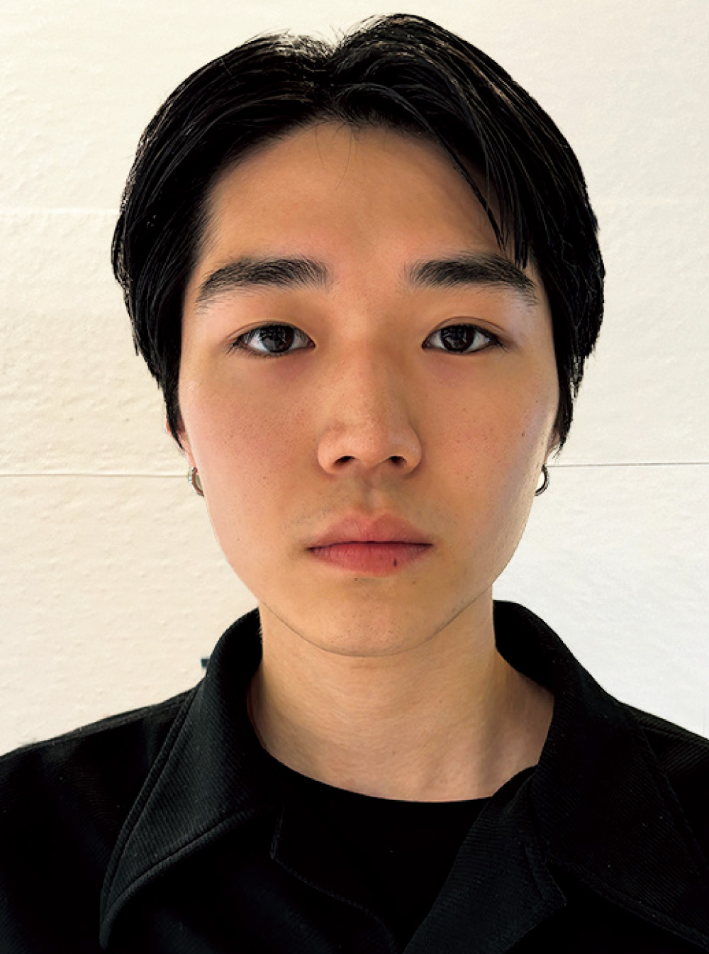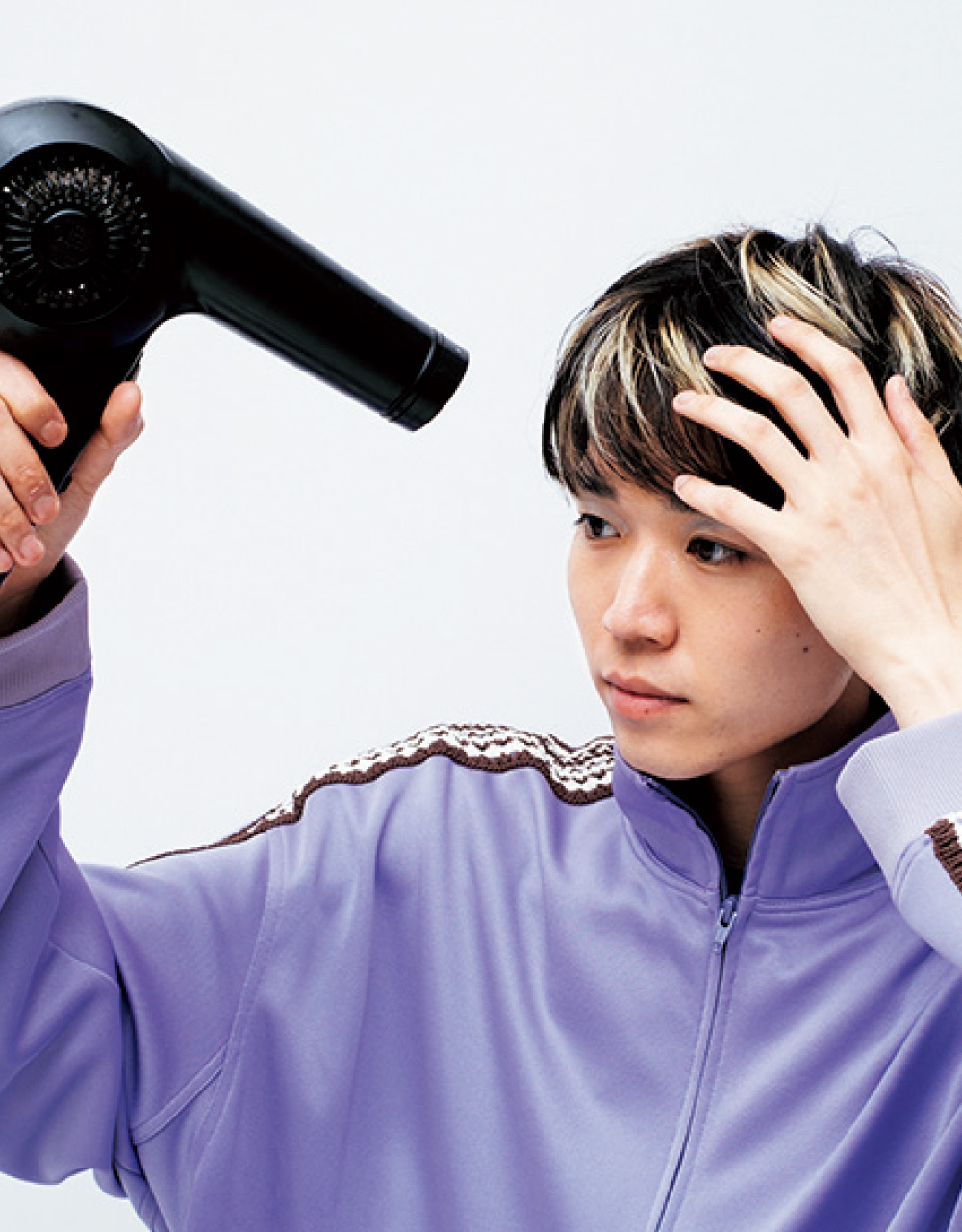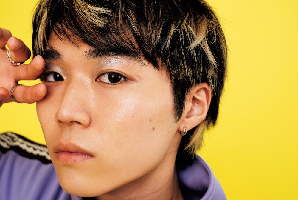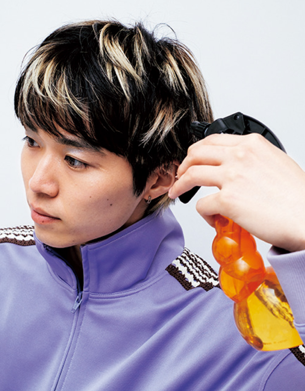 鮮やかなパープルが中性的な魅力を引き出すダブルジップのトラックジャケットは、下のジッパーを多めに開けることでバランスがきれいに取れる。パンツは単色だとヘアスタイルに負けて物足りなさが出てしまうので、デザインカラーに合わせてペイント柄をセレクト。アクセサリーはアイメイクに合わせてシルバーで統一し、スポーティなアイテムを使いながらも色数を抑えることでモードな雰囲気にまとめた。