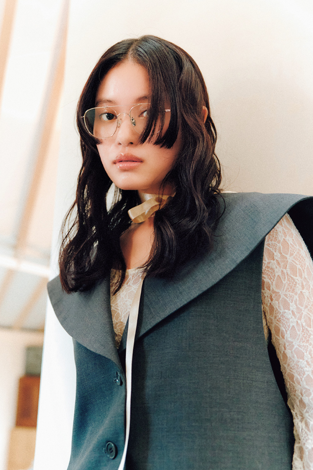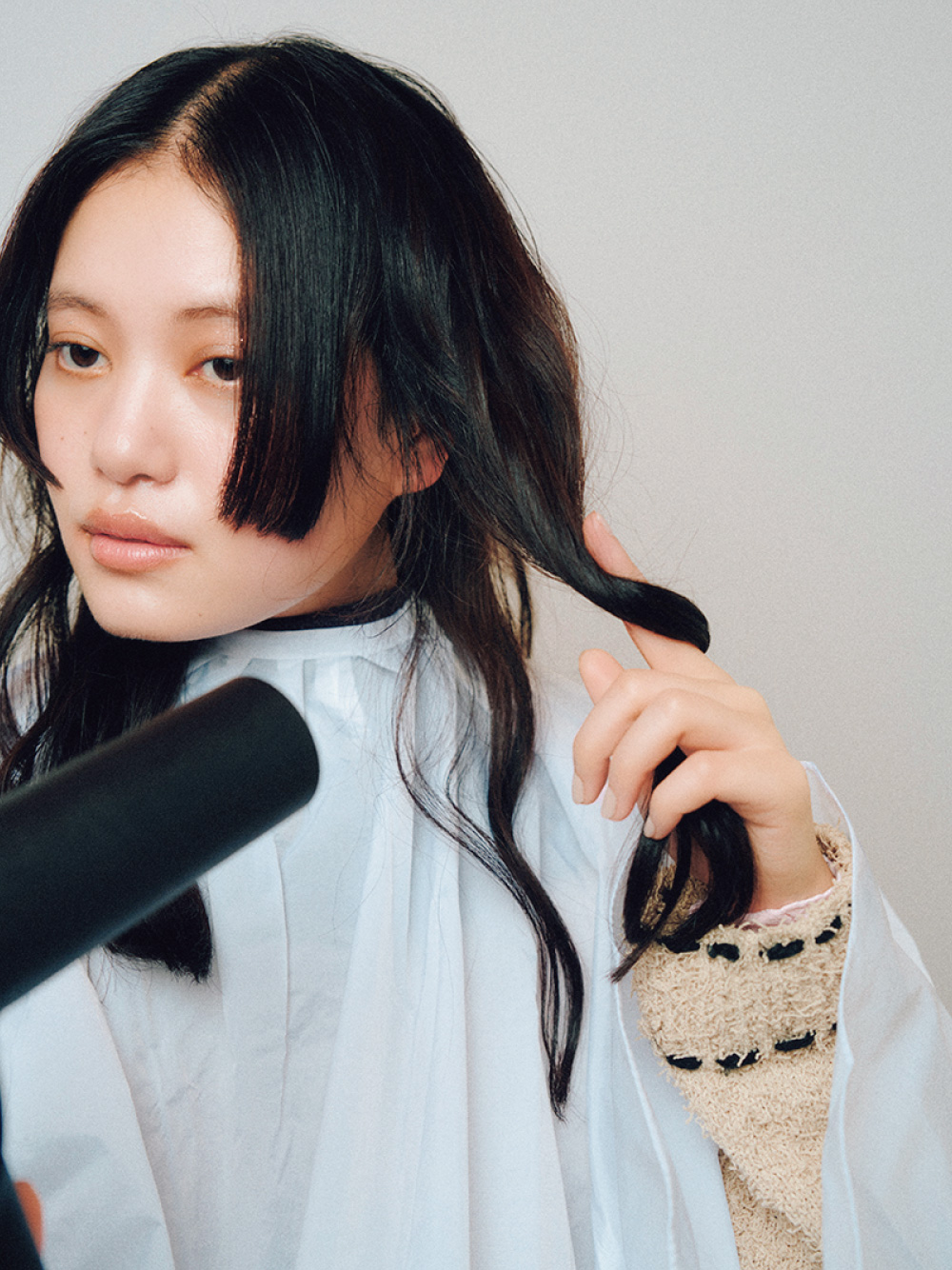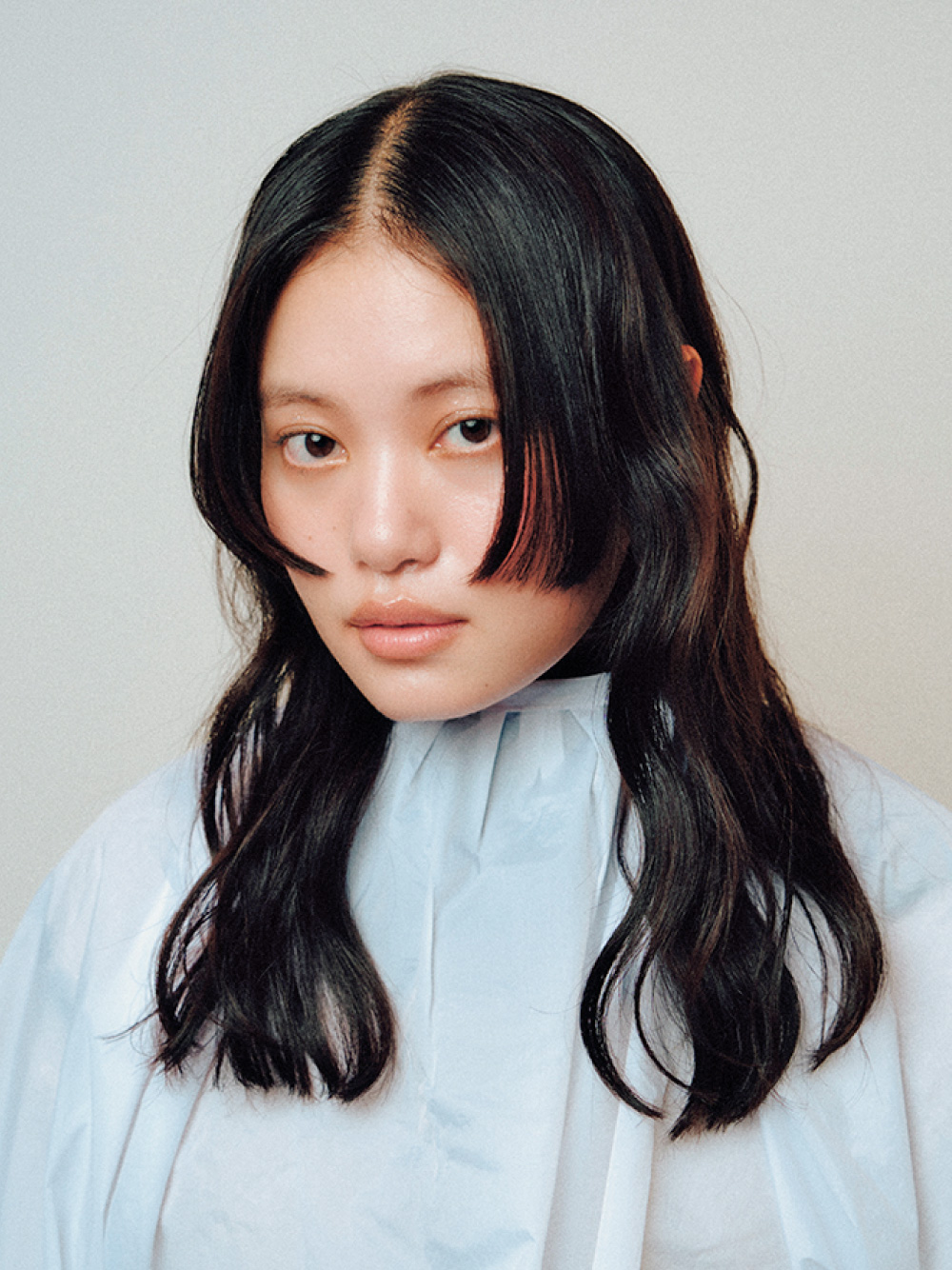 ともすれば、かわいくコンサバティブな印象にならなくもないセミロングのウェーブスタイル。その期待を良い意味で裏切るのは、ステップカットの前髪と、平行に揃った毛先、抑えられたウェーブの丸み。「だって、イメージ通りじゃ面白くないでしょ?」そんな彼女の声が聞こえてくる。