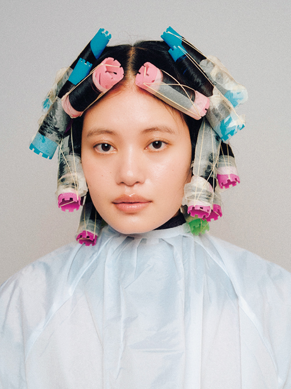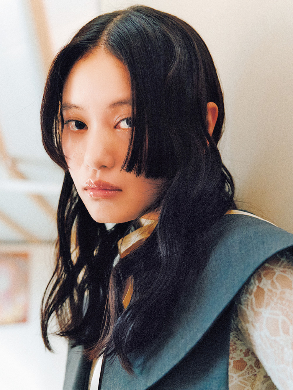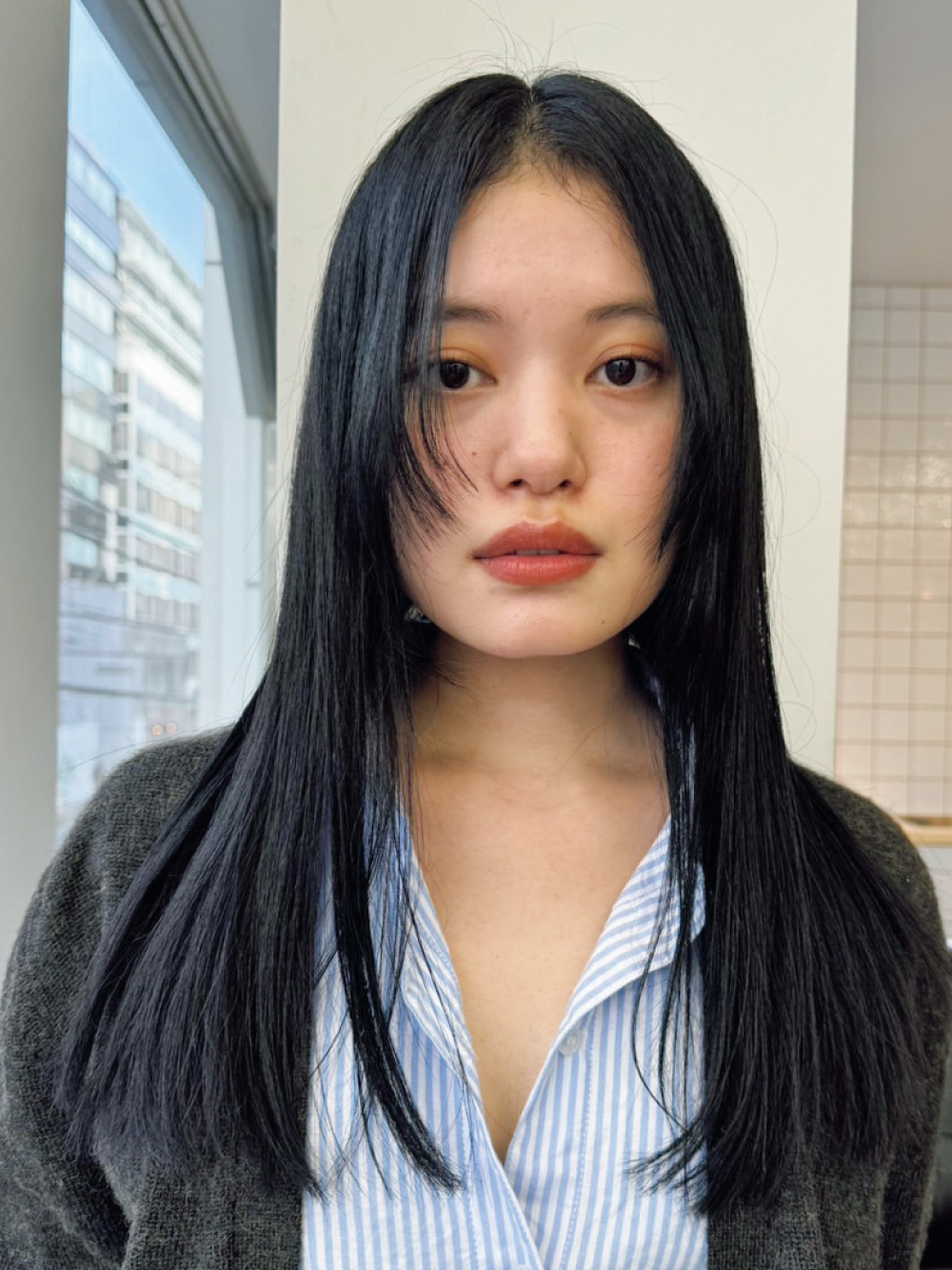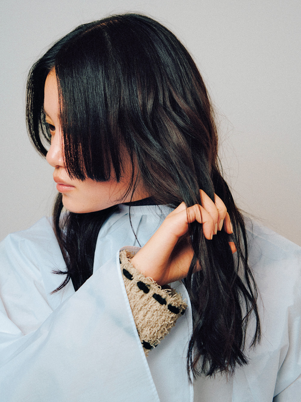 ともすれば、かわいくコンサバティブな印象にならなくもないセミロングのウェーブスタイル。その期待を良い意味で裏切るのは、ステップカットの前髪と、平行に揃った毛先、抑えられたウェーブの丸み。「だって、イメージ通りじゃ面白くないでしょ?」そんな彼女の声が聞こえてくる。
