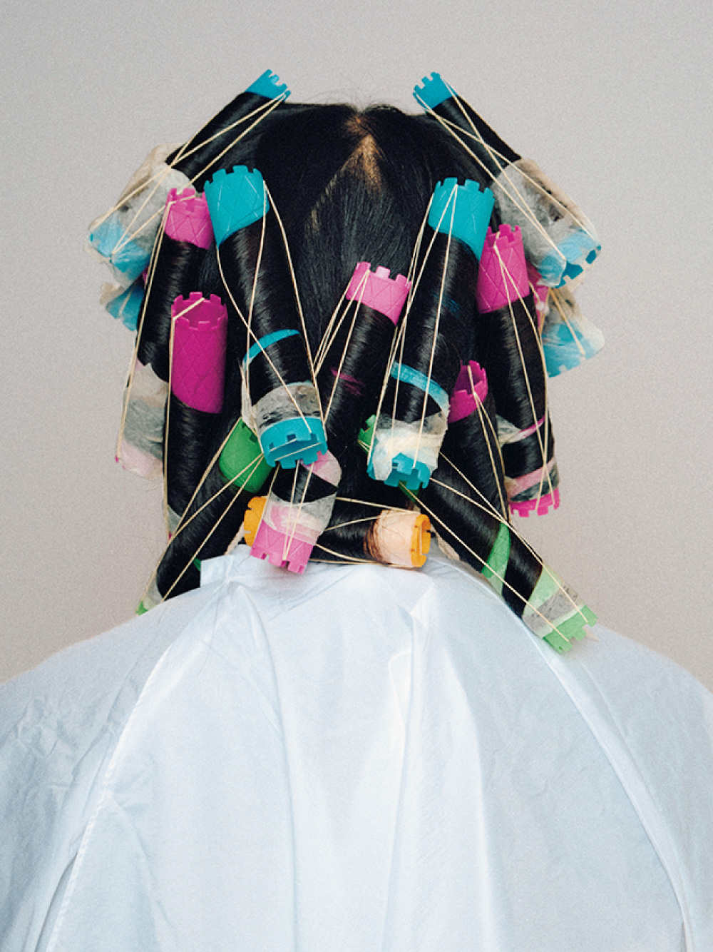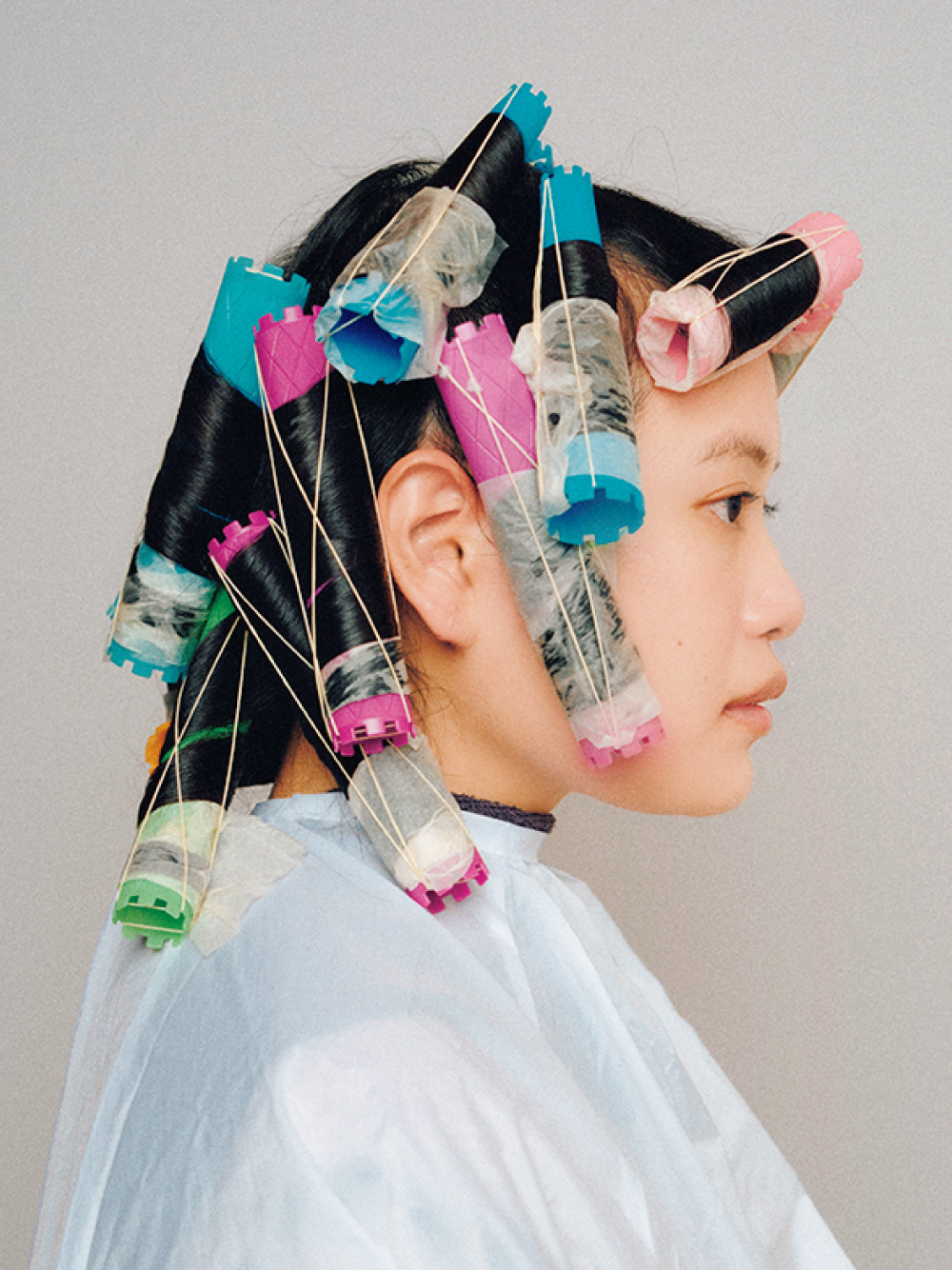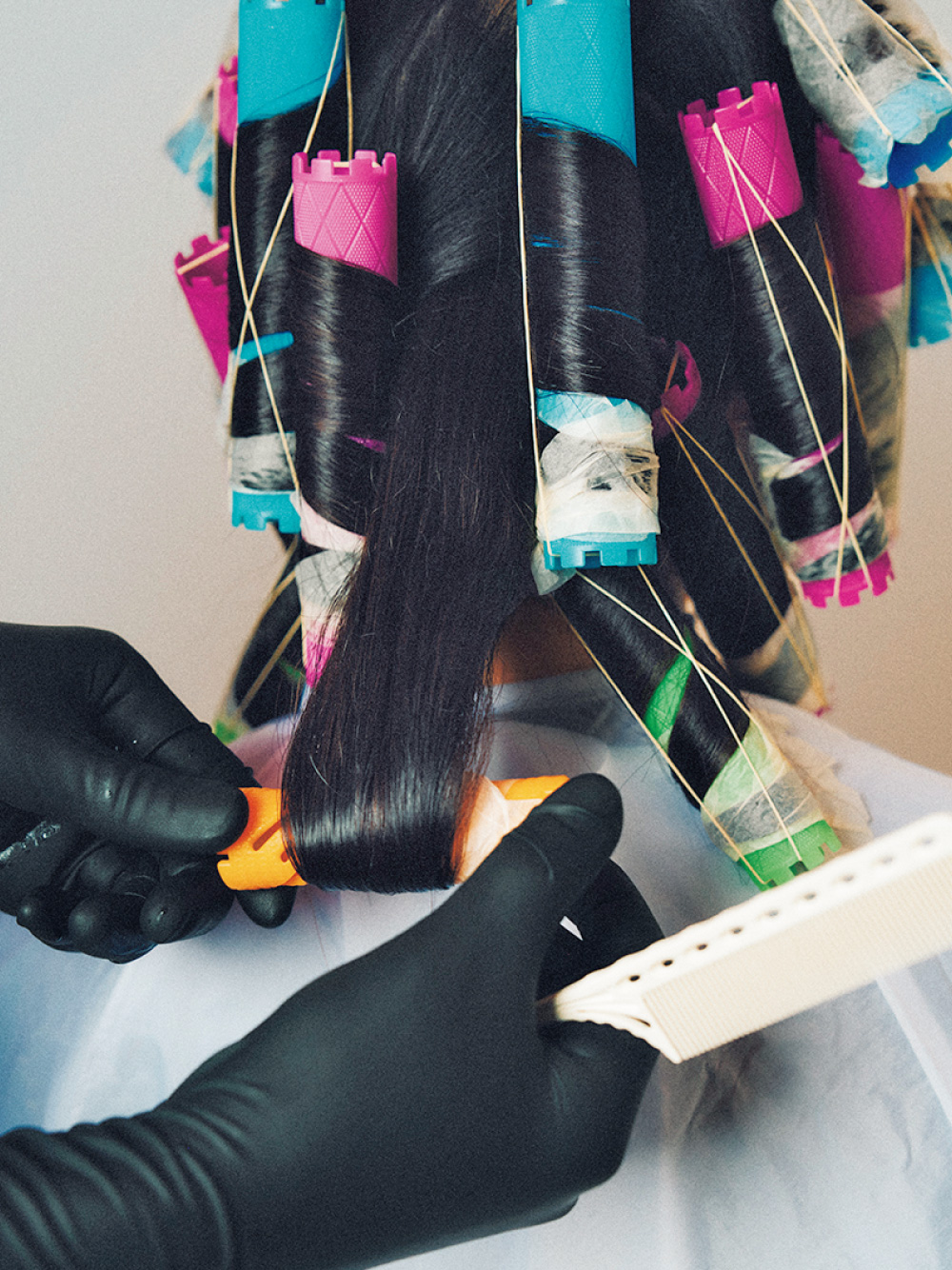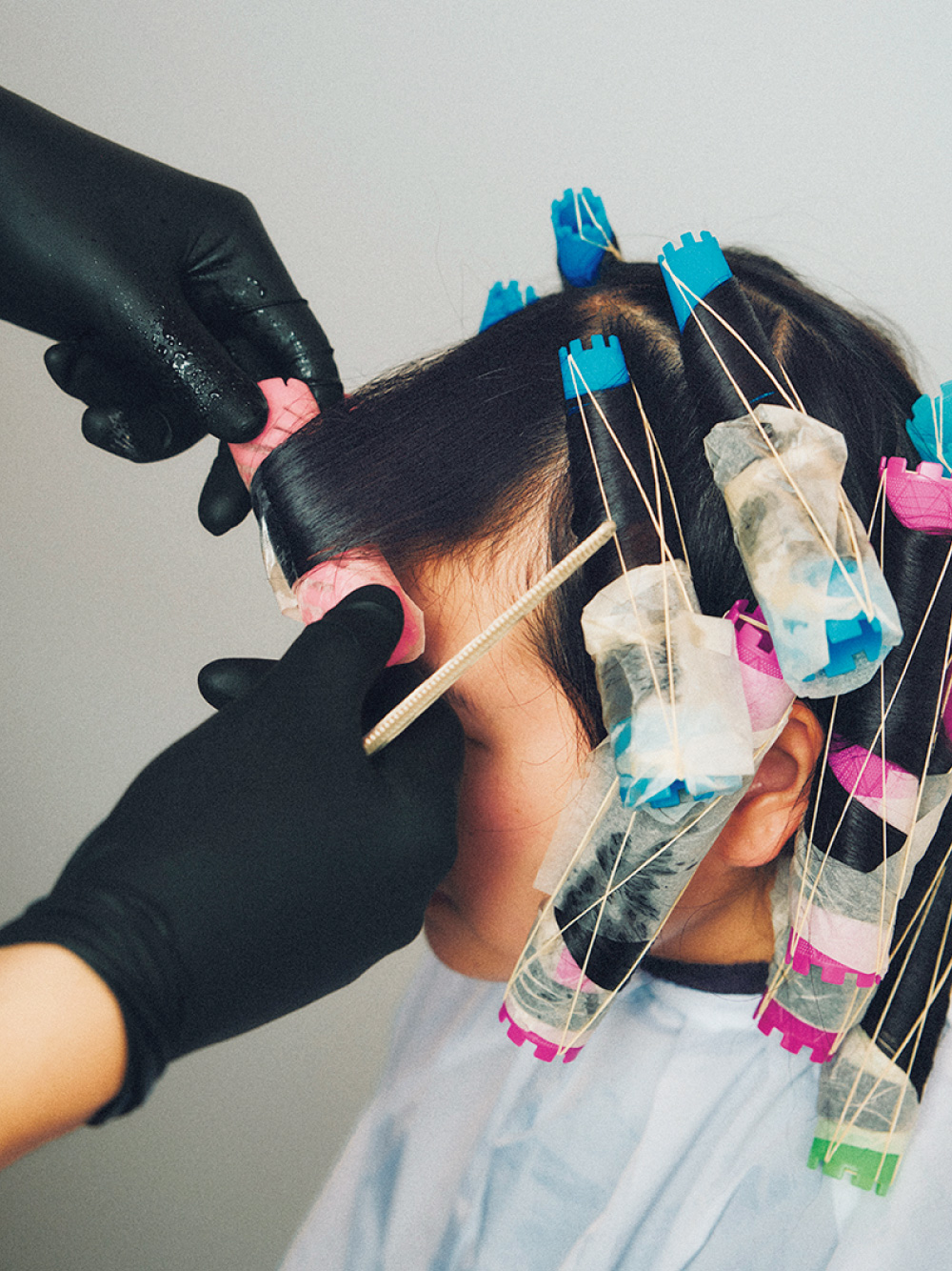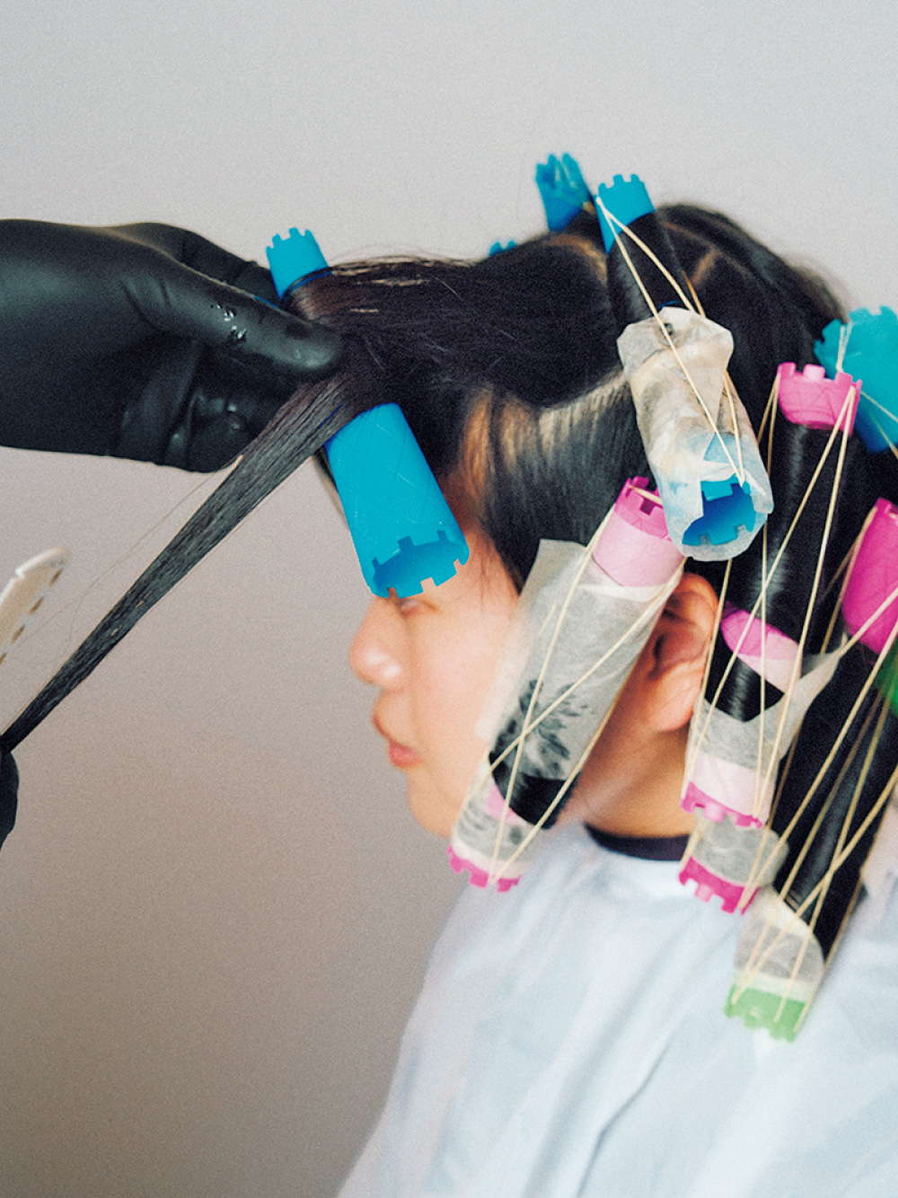 バック(ネープ上のセンター) はAラインを崩さないよう、あえてここだけショートロッドで毛先から3回転巻く。