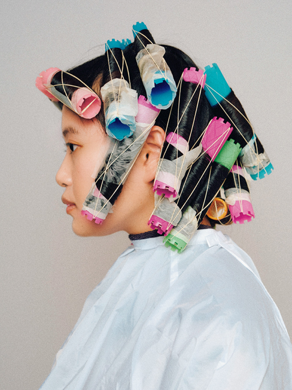 サイドは上下2段に分け、上段は円錐ロッドをフォワードに中間から毛先まで巻き込む。下段はロングロッドを毛先からリバースに巻く。