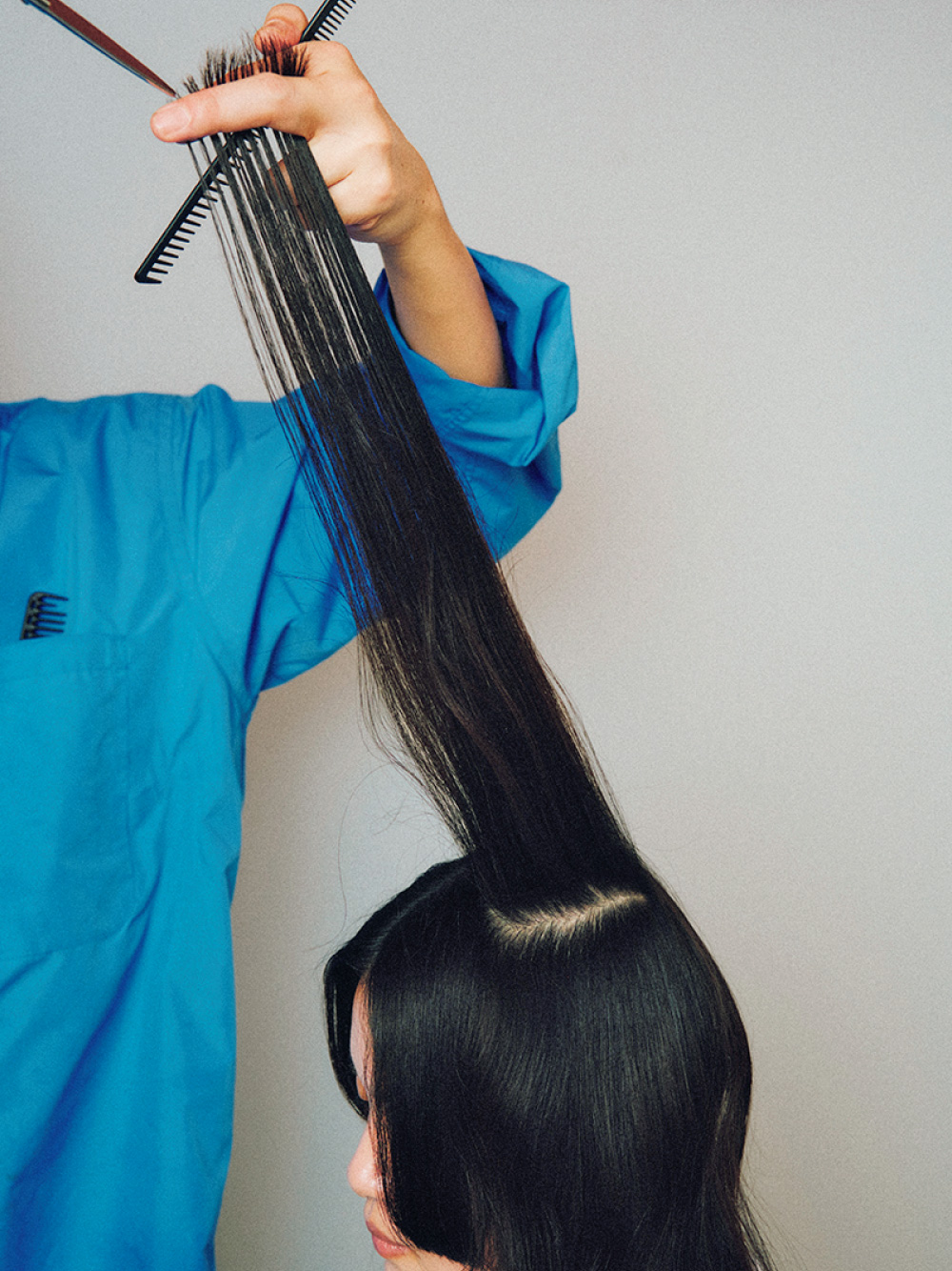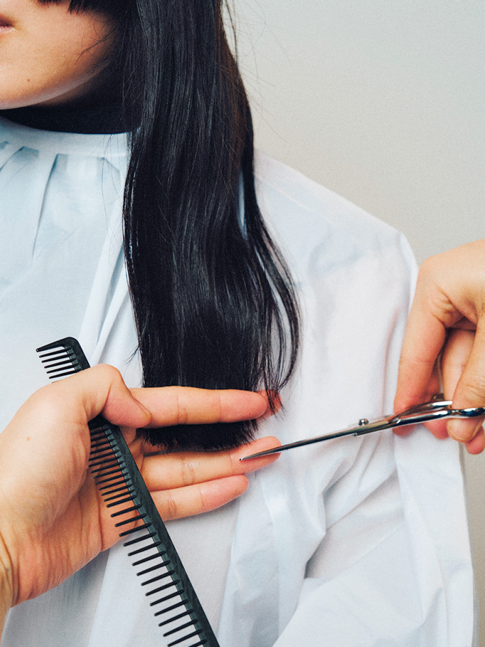 前に持ってきた時にラインがでるように、肩の前に引き出して平行にカットする。