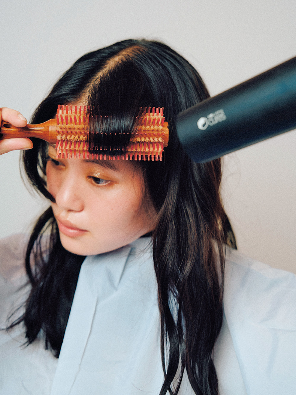 バングは広めの三角ベースを取り、左右に分けて毛先からワンカール内巻きになるように平巻き。