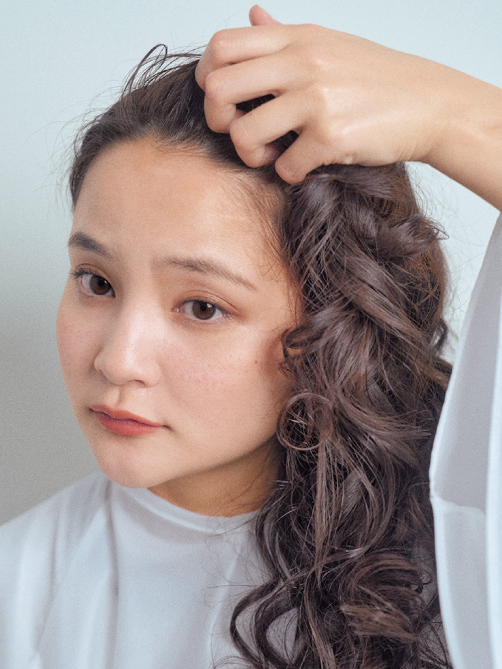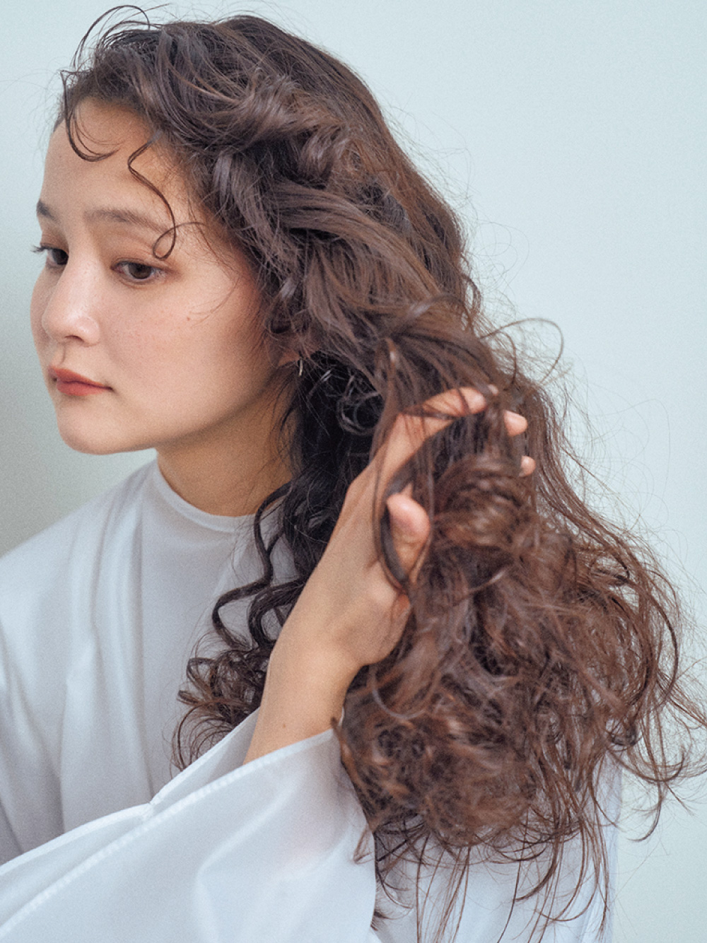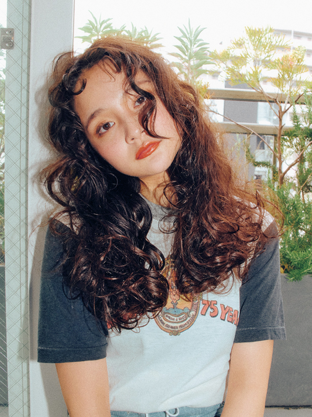 90年代の雰囲気に今のトレンドを織り交ぜた「令和版PUFFY」が今回のテーマ。Aラインで重さを残したシルエットが特徴で、中間は ウェーブを強調し、毛先はドライな質感で遊びを持たせました。カラーは、暖色系のアドミオ シエナに透け感のある寒色系のティアを効かせ、万人が好む コンサバティブな髪色をさらに超えた、深みのあるカラーに仕上げています。
