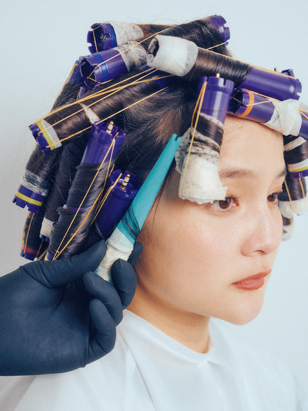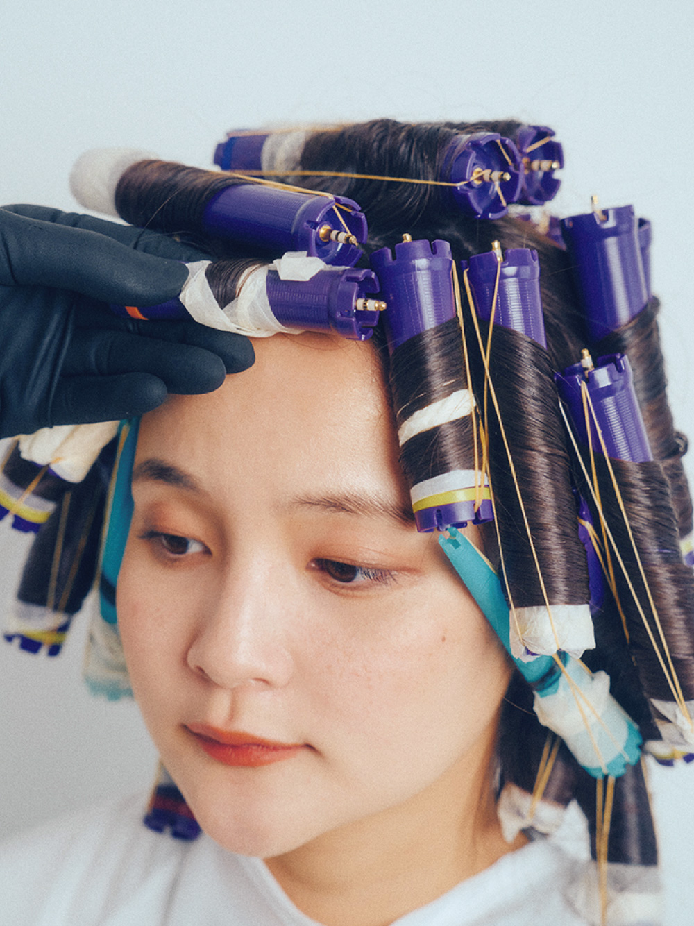 顔まわりと前髪は髪の長さに合わせて、ショートロッドで巻いて動きをつける。