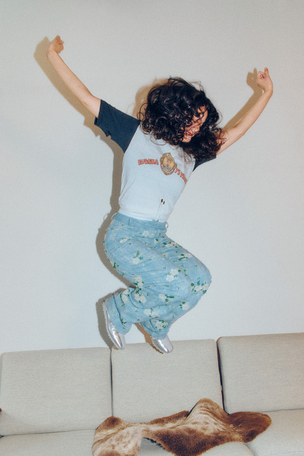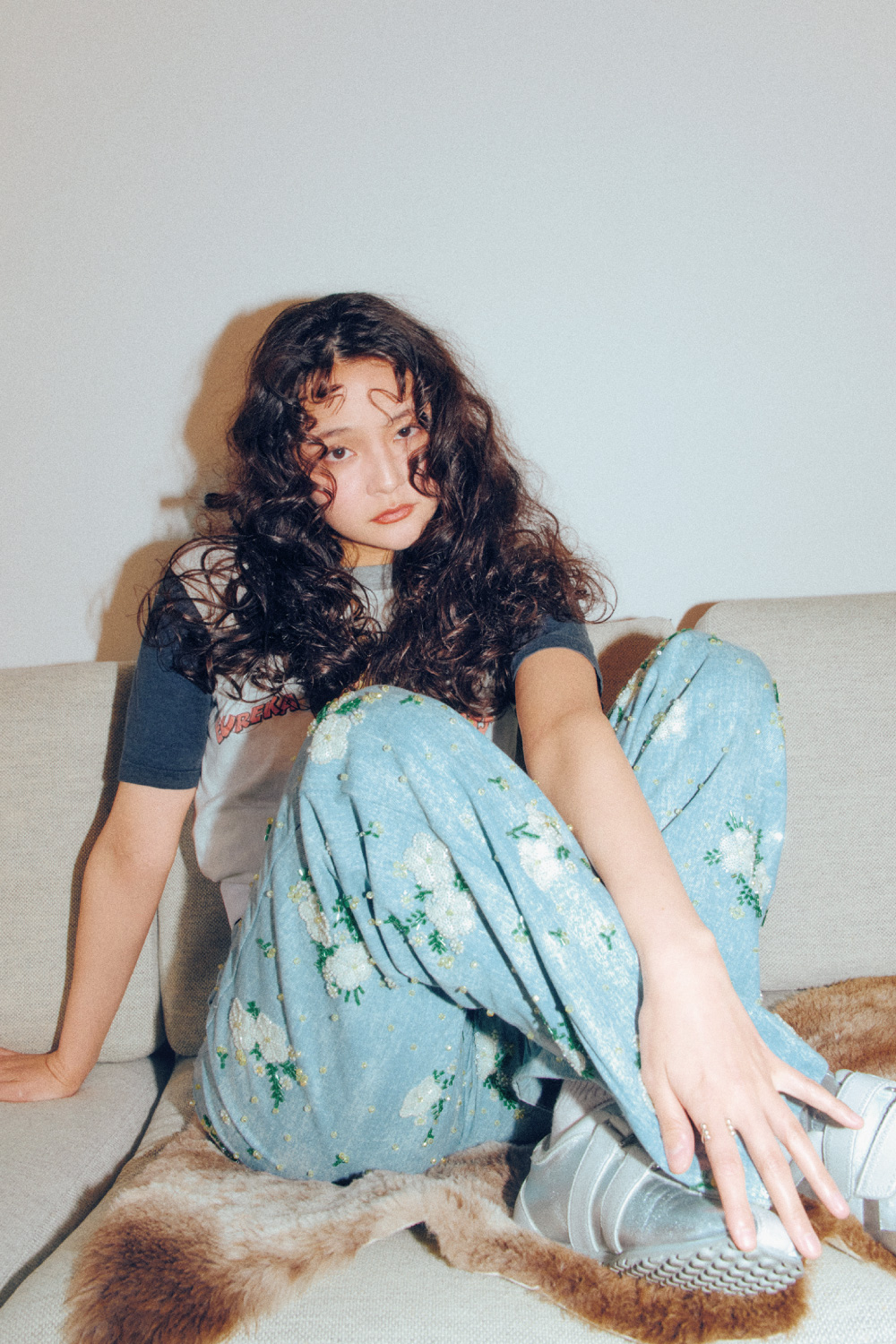 タイトなTシャツとデニムという90年代の定番 スタイルを、令和風にスタイリング。 アクセサリーの代わりにビジューのついたデニムやシルバーのスニーカーをセレクトし、ギャルっぽくならない、だけどカジュアルにもなりすぎない、ちょうどいい温度感の着こなしに。