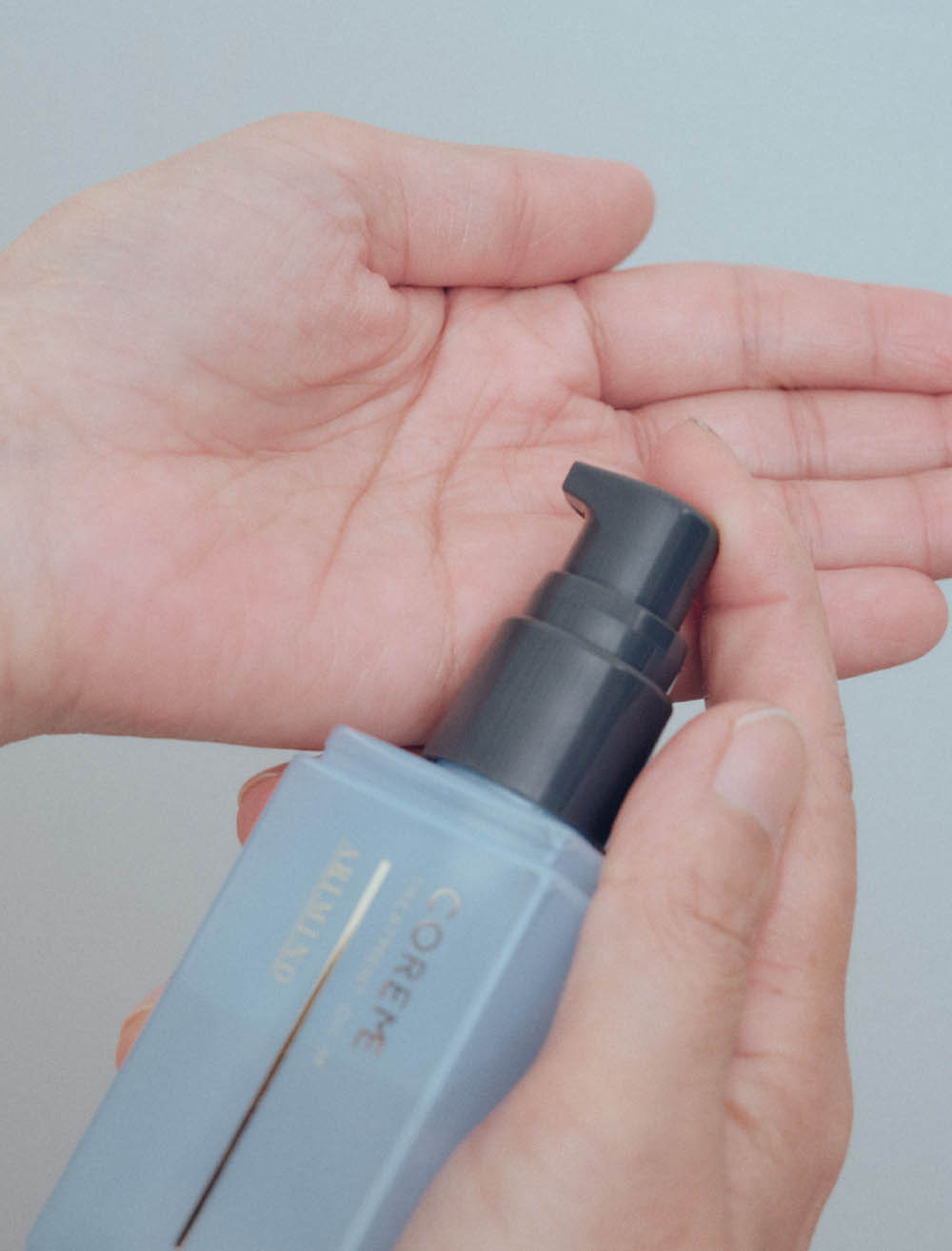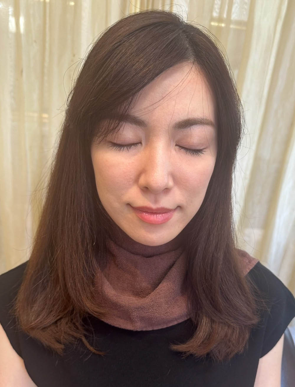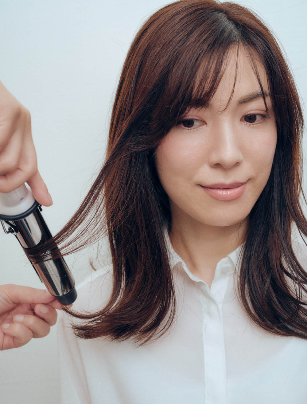 こだわったのは、エイジングを感じさせないツヤと、 軽やかさや柔らかさ。シングルカラープロセスの前後にコアミーのトリートメント処理を丁寧に施すことで、よりツヤ感と透明感が表現できました。縮毛矯正をしている髪はカラーした際に赤みが出やすくなりますが、前後処理で髪の状態を整えておけば赤みも軽減できます。
