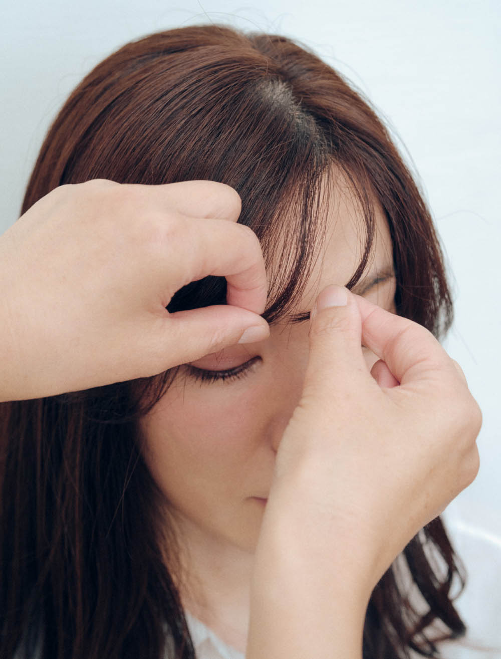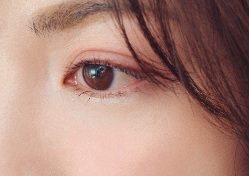 ピンク系のアイシャドウで目元にナチュラルな血色感を出し、レッドブラウンのアイラインを引く。パーツの良さを生かした引き算メイクを基本としつつ、 ポイントに赤系のカラーを加えることで大人女性の魅力が引き立つ。
