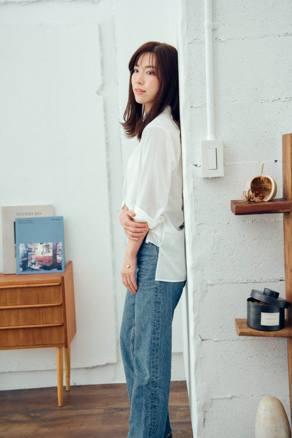 シンプル・イズ・ベストなコーディネートだからこそ、着こなしに自分らしさを。シャツは前側だけデニムにインして、袖口はロールアップして抜け感を演出。手首に輝く華奢なブレスレットで、カジュアルすぎない大人のスタイルへ。