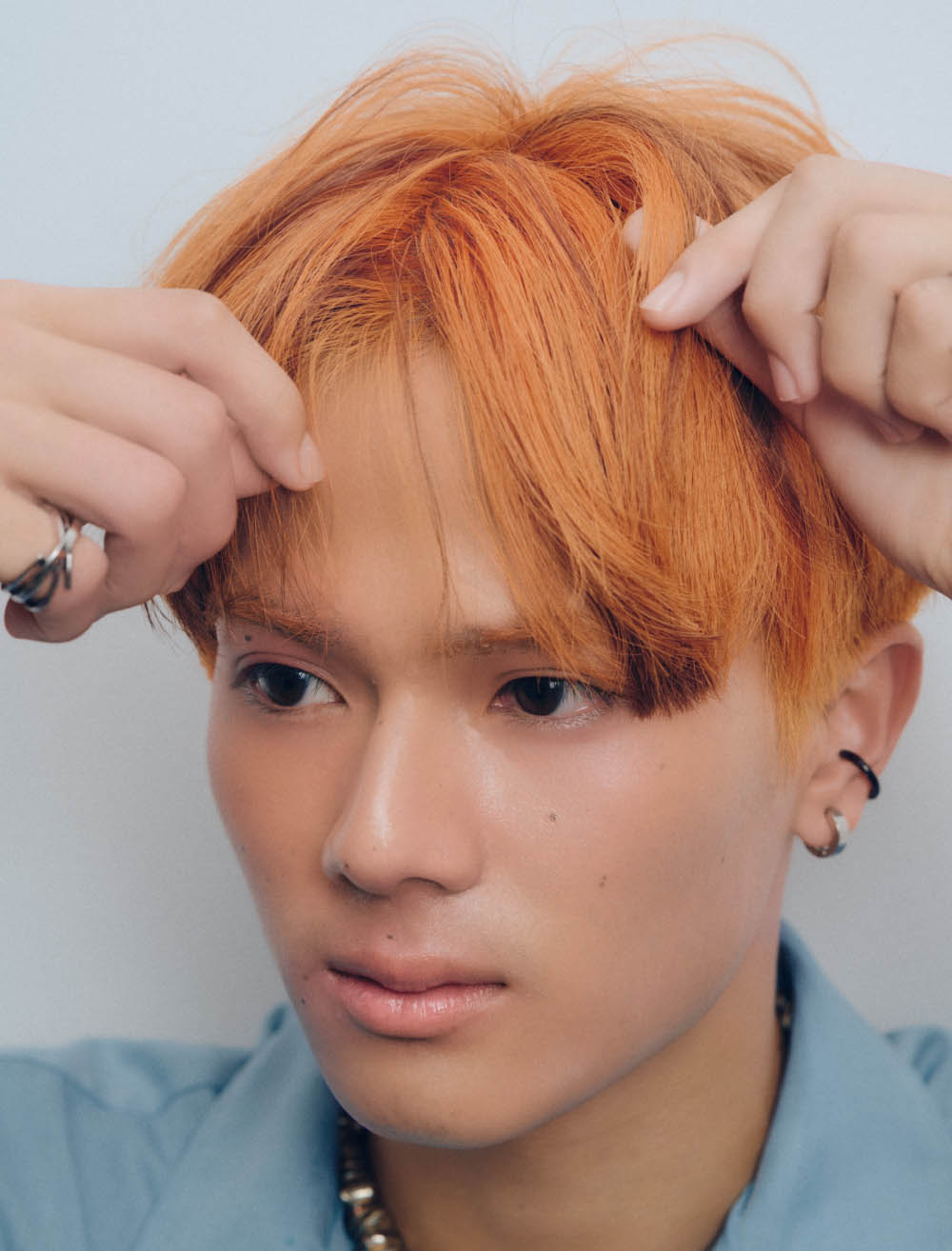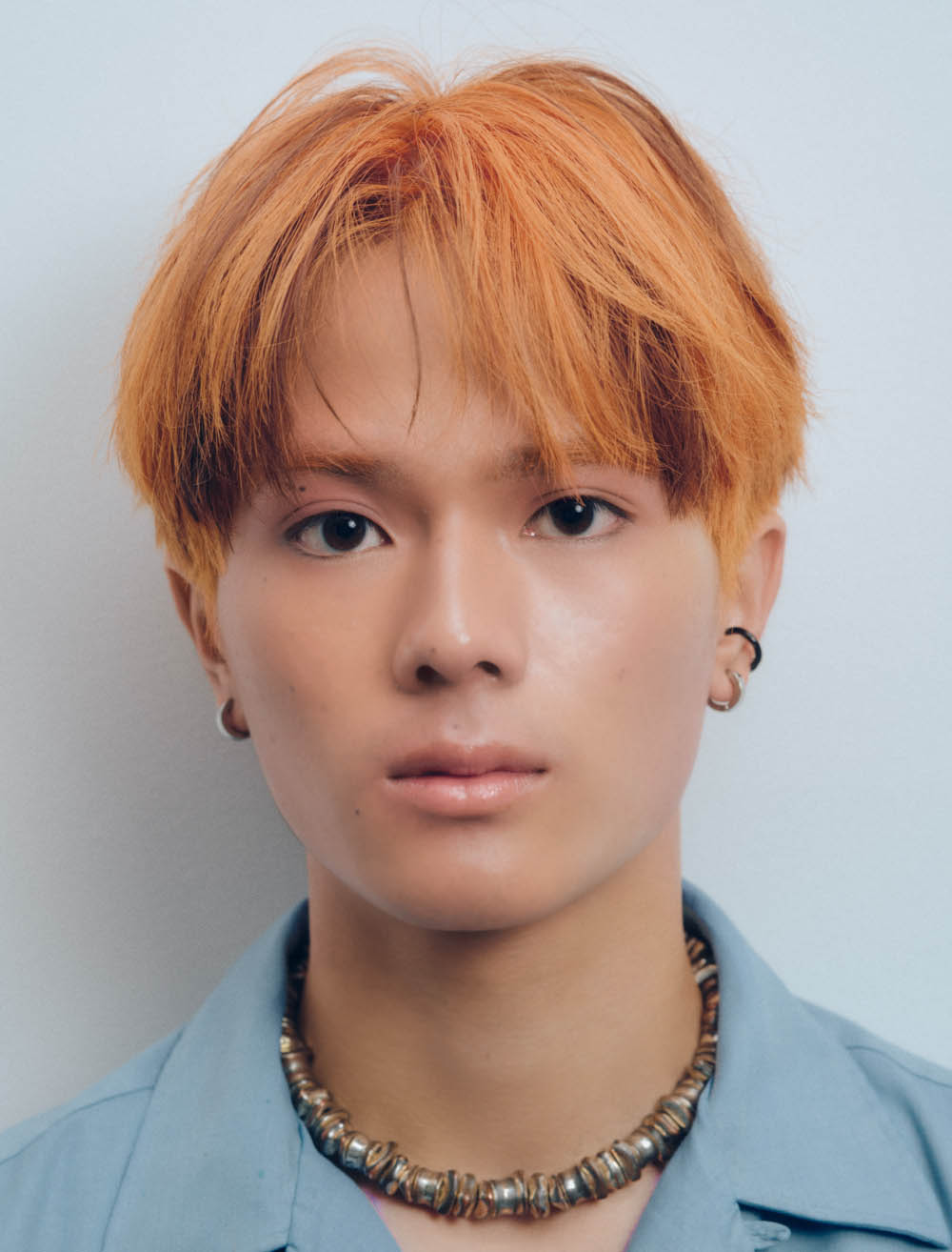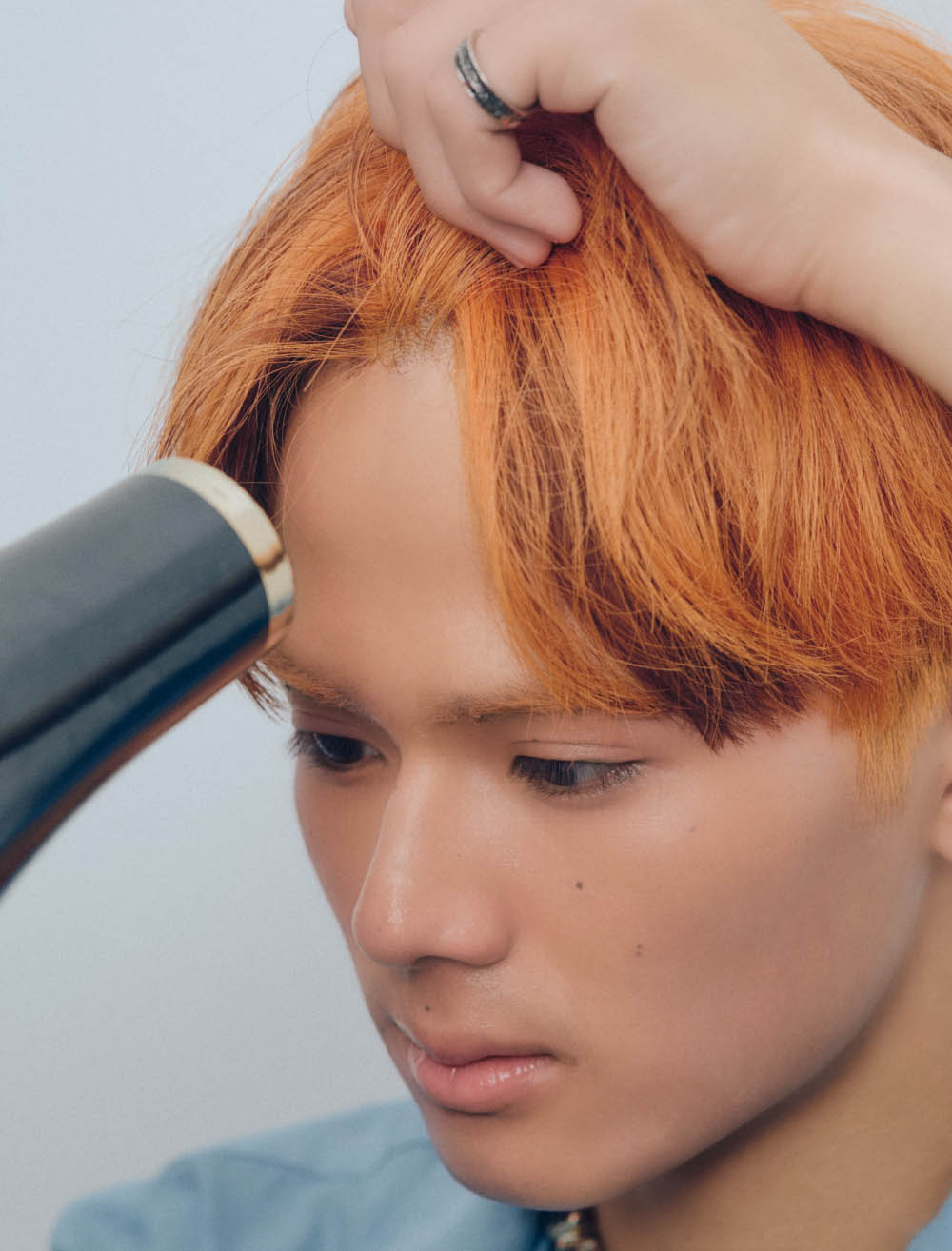 一見ラフで野暮ったいのに、実はおしゃれで人目を引く、イメージしたのはそんなムードメーカーの男の子。オレンジの色味をブラウンで程よくくすませ、顔周りはローライトのアクセントで引き締めて、 スタイリングは流行りのツヤ感よりドライ感を意識。こうした“はずし” を持たせることで、無造作な中にも新しさが感じられるようにしました。