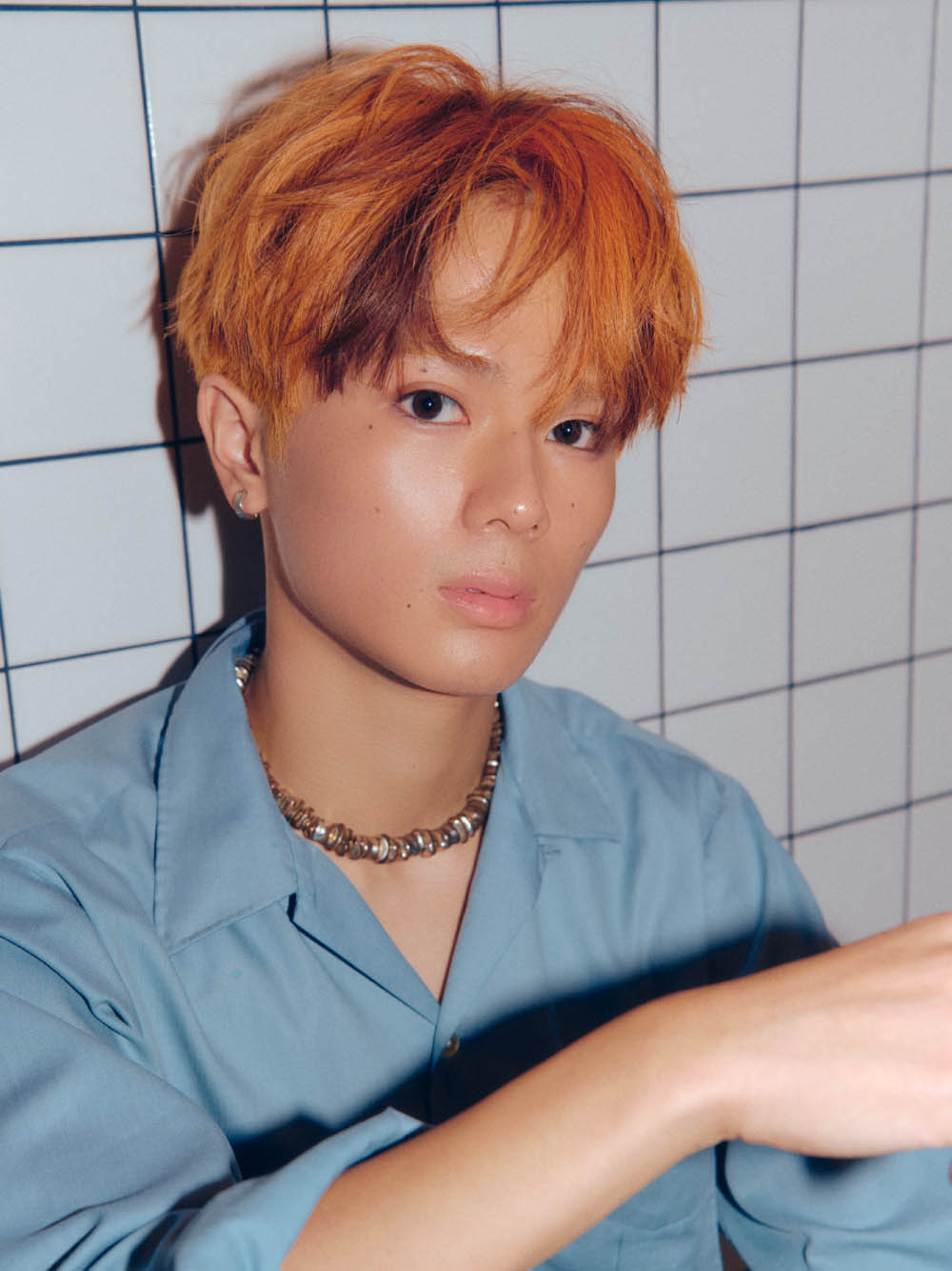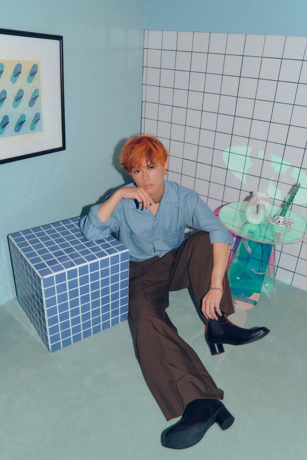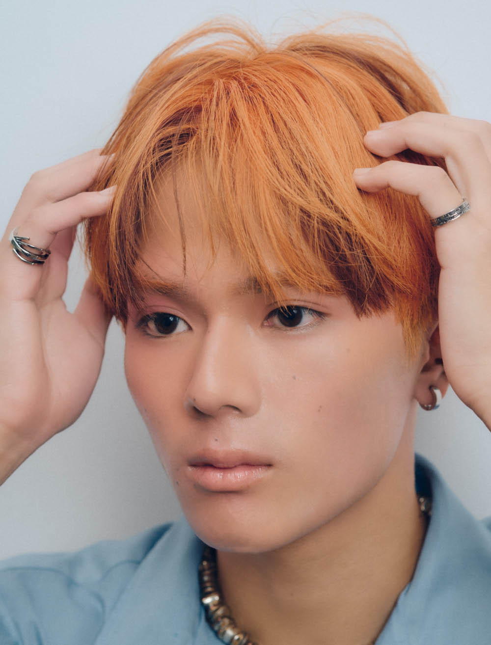 一見ラフで野暮ったいのに、実はおしゃれで人目を引く、イメージしたのはそんなムードメーカーの男の子。オレンジの色味をブラウンで程よくくすませ、顔周りはローライトのアクセントで引き締めて、 スタイリングは流行りのツヤ感よりドライ感を意識。こうした“はずし” を持たせることで、無造作な中にも新しさが感じられるようにしました。