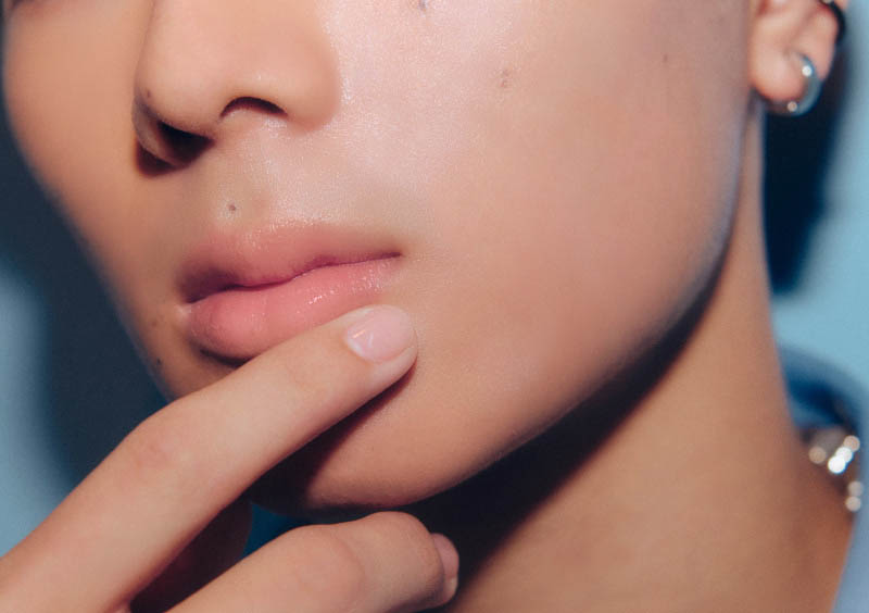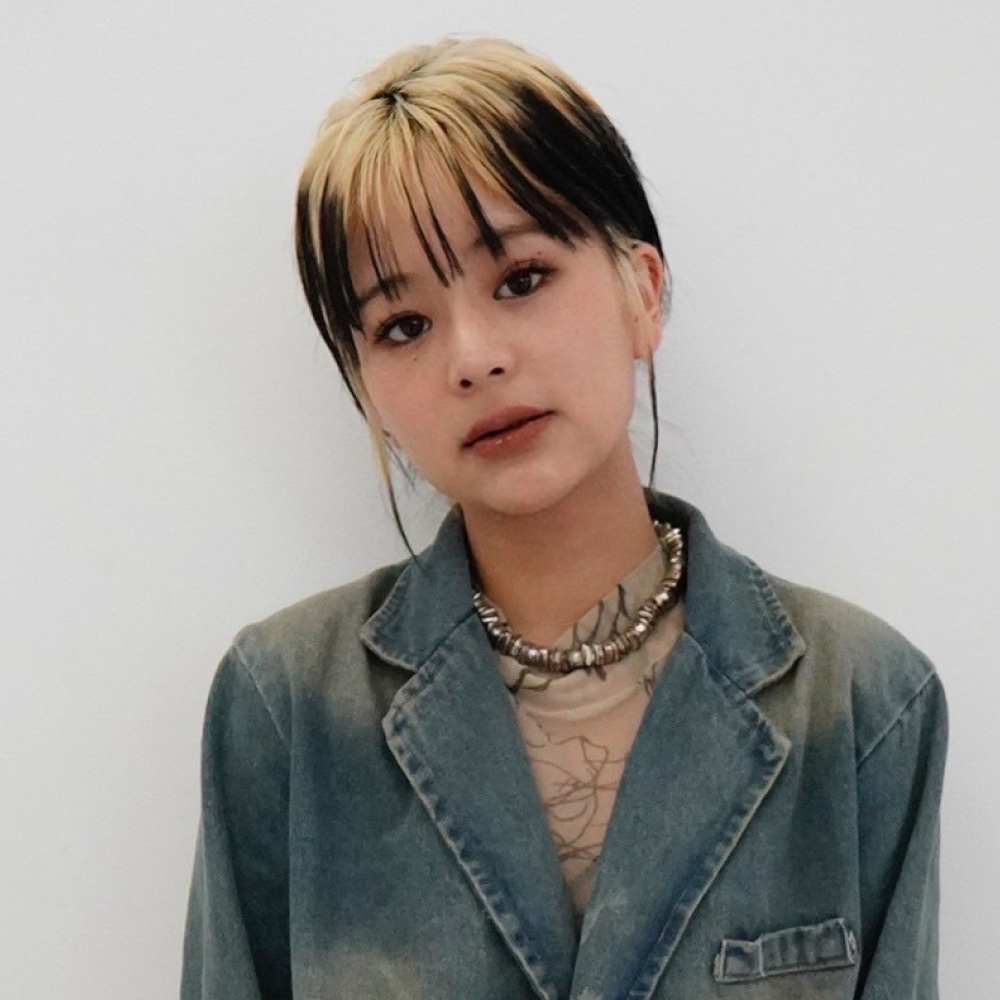 髪色になじむよう軽くオレンジのリップカラーで色味を整え、透明のリップグロスで自然なツヤを出す。リップカラーをしっかり塗るより、 グロスのツヤ感を主役に。
