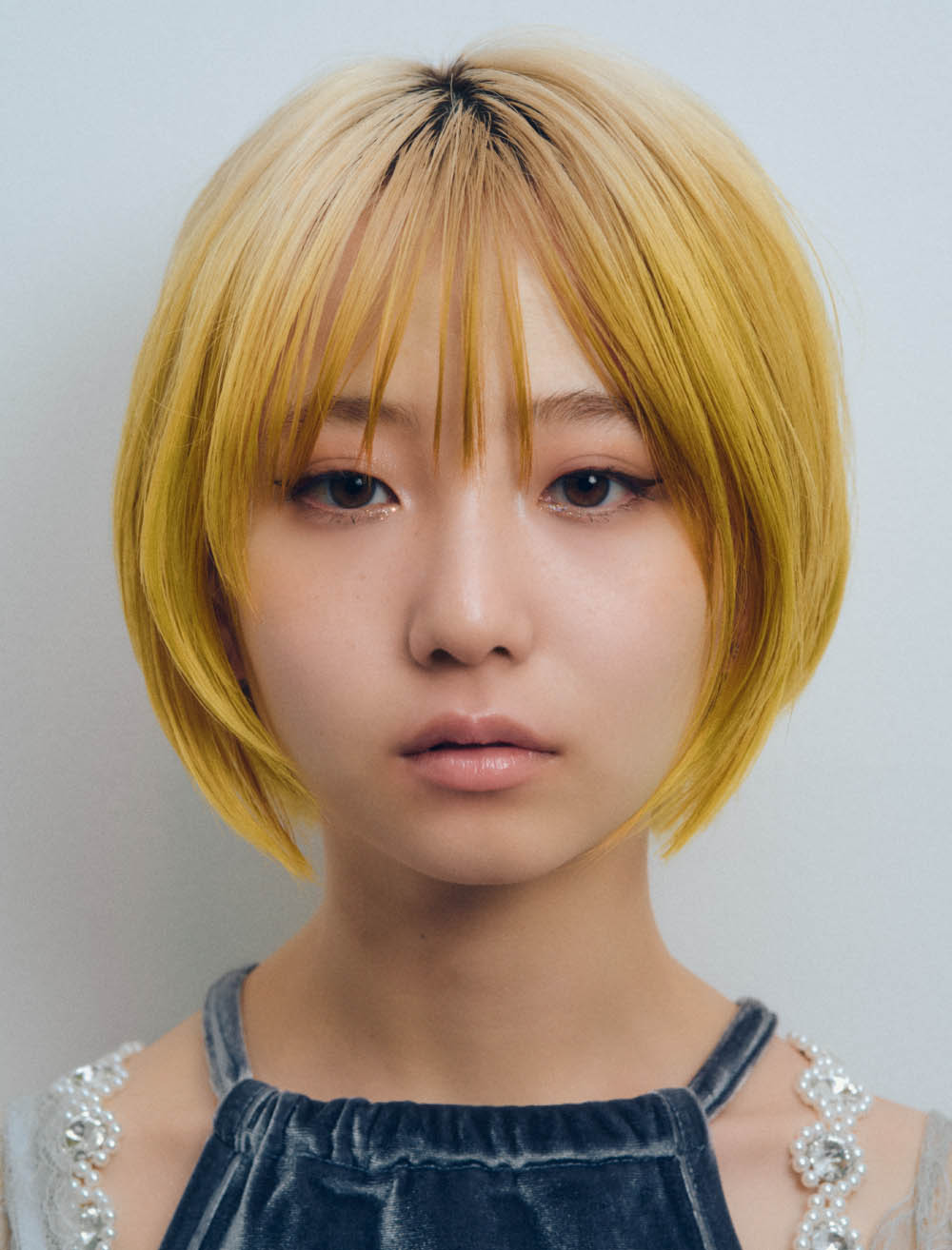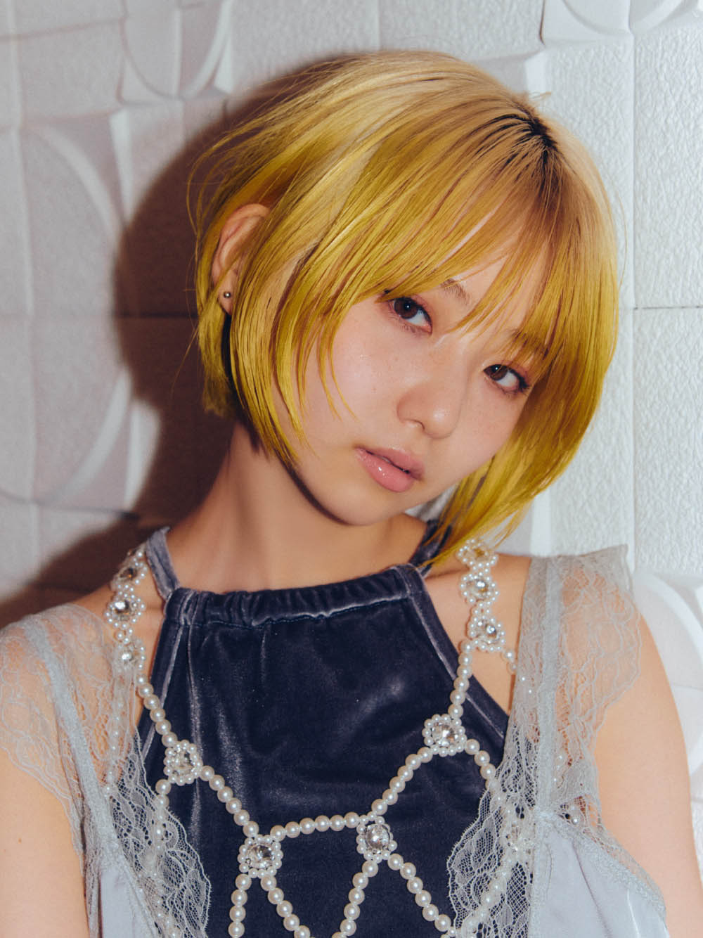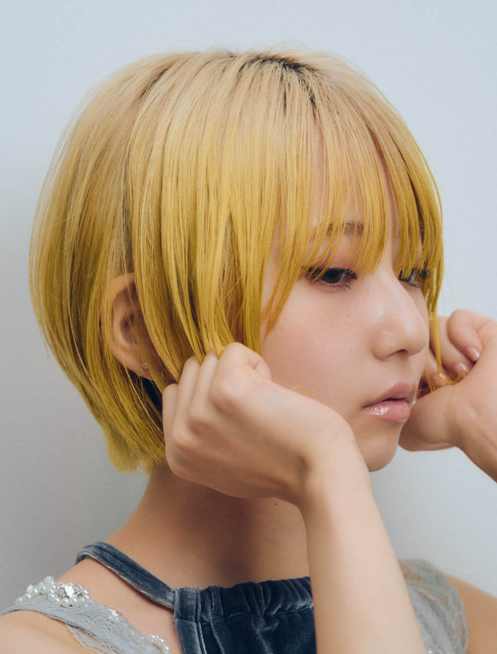 芯の強さを感じさせる、イエローグラデーションのショートボブ。長めの前髪から覗く視線が、賑やかなパーティーが終わった先の世界を見つめている。90年代のインディーズ映画を彷彿とさせる、どこか気だるく厭世的で、媚びないクールな雰囲気の中で。