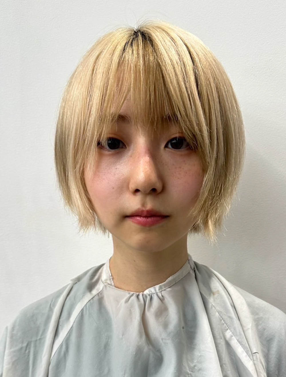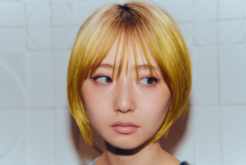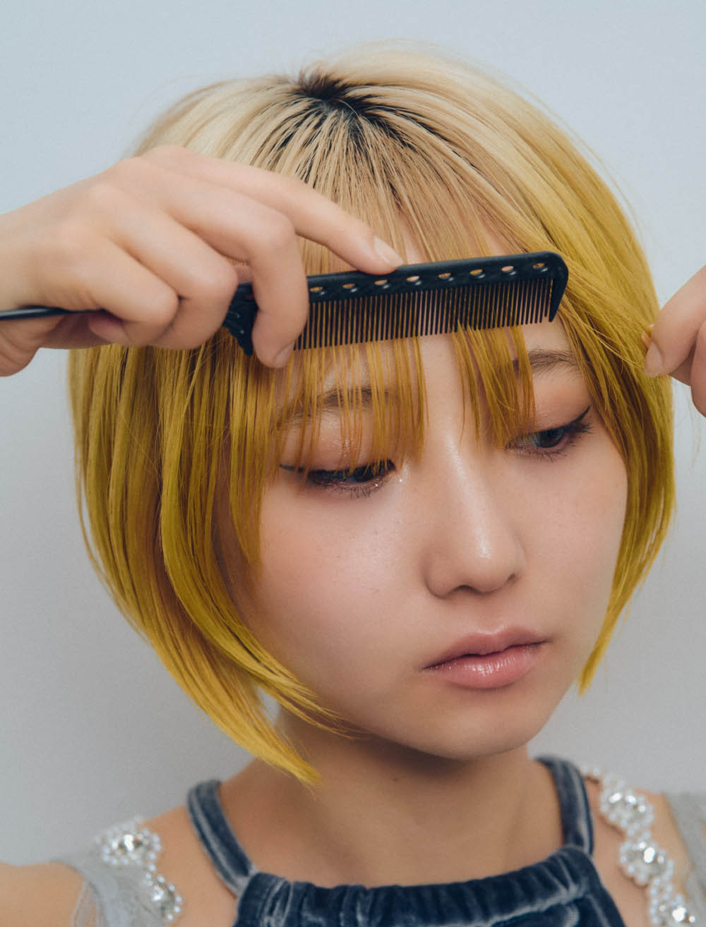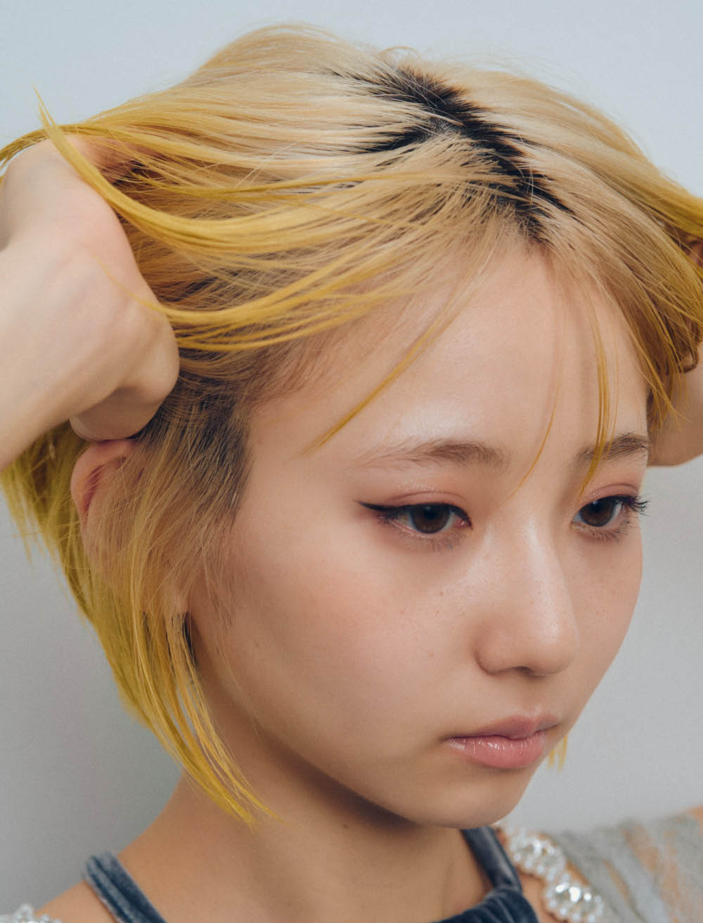 芯の強さを感じさせる、イエローグラデーションのショートボブ。長めの前髪から覗く視線が、賑やかなパーティーが終わった先の世界を見つめている。90年代のインディーズ映画を彷彿とさせる、どこか気だるく厭世的で、媚びないクールな雰囲気の中で。
