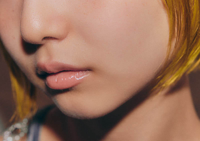 リップも色味よりツヤ感を重視。ヌーディーカラーに透明グロスをオンして、質感で魅せる口元へ。